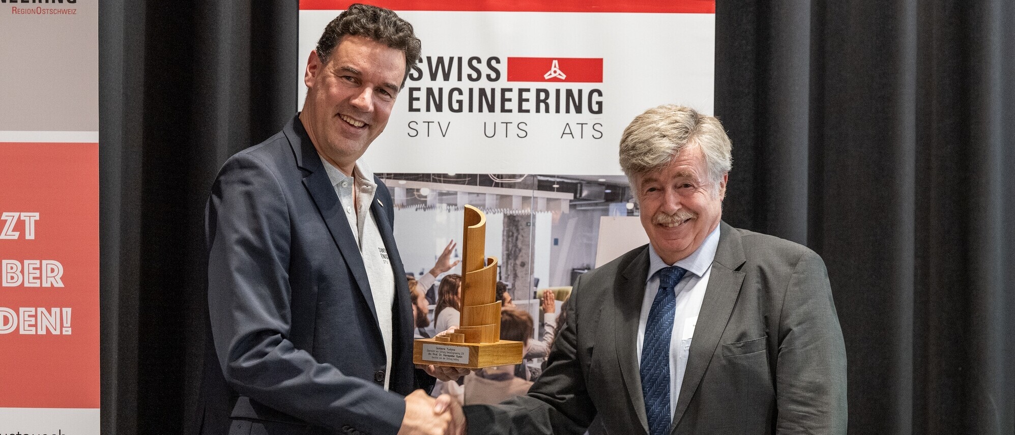 Im Rahmen der Delegiertenversammlung von Swiss Engineering am 8. Juni 2024 hat Peter Moser, Mitglied des Zentralvorstands, Hanspeter Gysin die «Goldene Turbine» überreicht. Die Auszeichnung der Stiftung BildIng und der Stiftung von Swiss Engineering würdigt Personen, die sich mit herausragenden Beiträgen für die Technik-Bildung in der Schweiz engagieren.