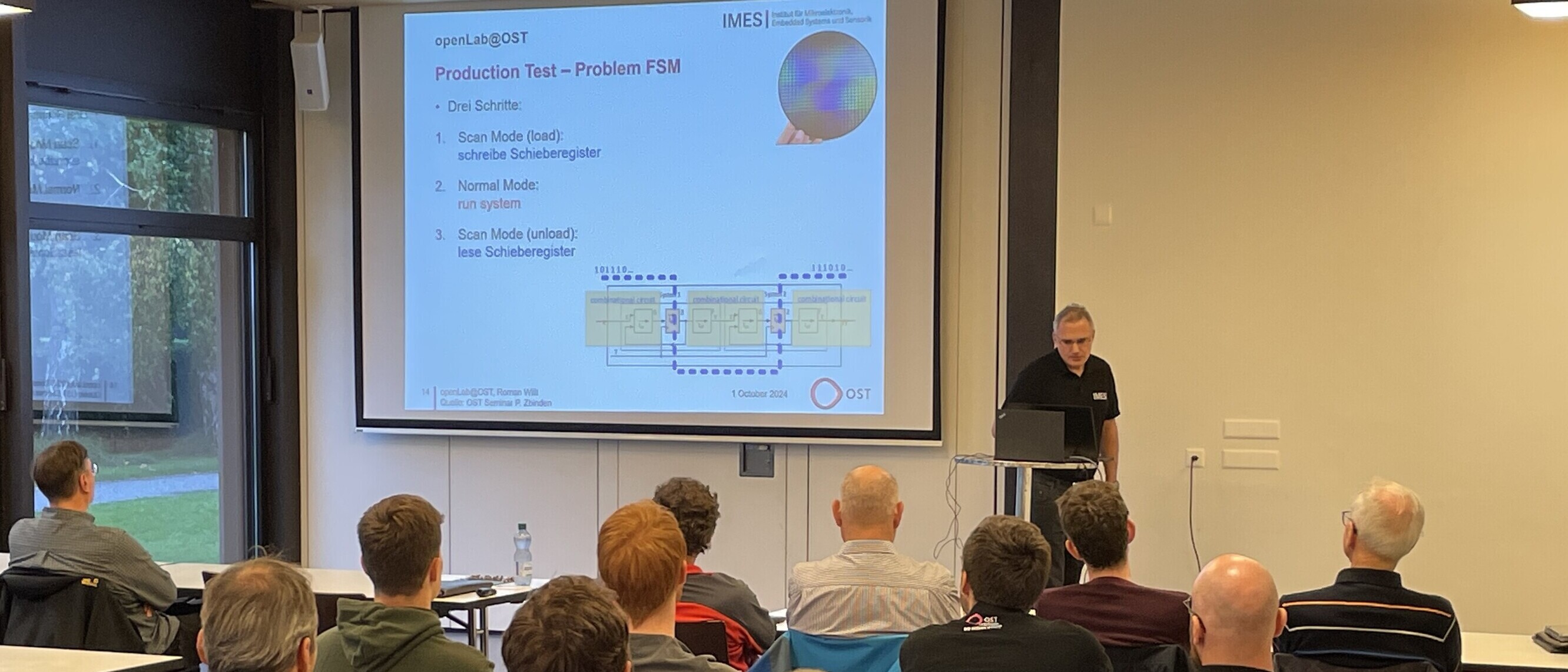 Die IMES Lecture Microelectonics vom 1. Oktober befasste sich ausführlich mit dem Testen von Mikroelektronik. Franz Haas führte die Anwesenden in das Thema Robot Framework ein. Roman Willi stellte unter anderem das neue OpenLab@OST des IMES vor, das für Tests gemietet werden kann.
