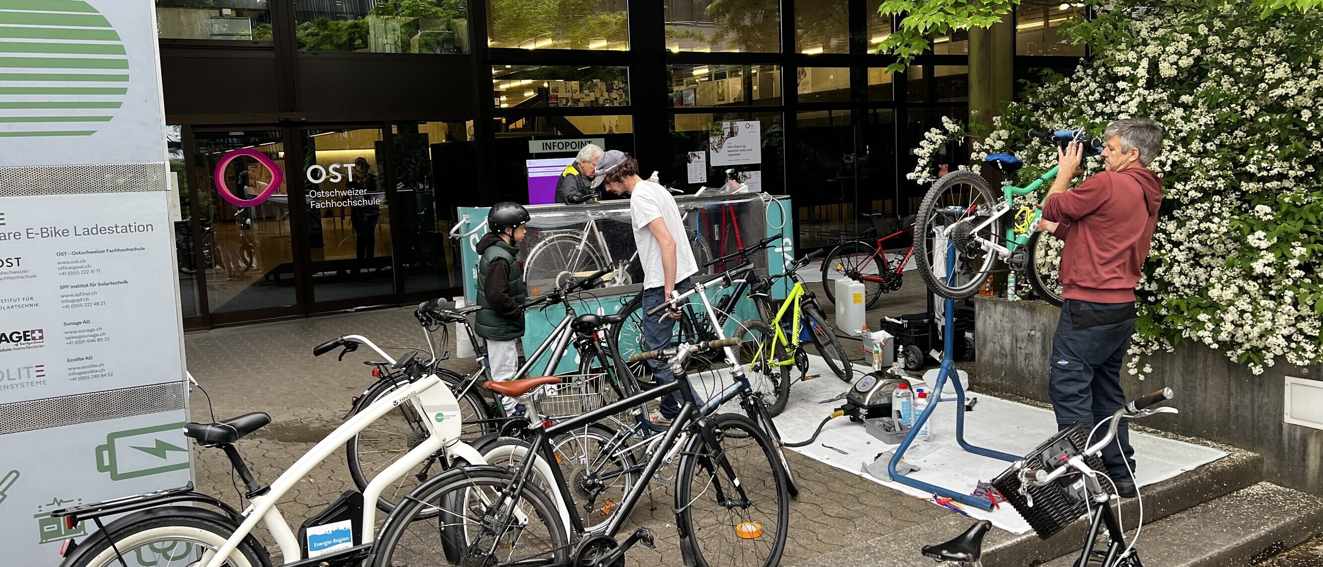 Komm vorbei und lasse dein Velo einem Check-up, einer Wäsche oder kleinen Reparaturen unterziehen. Zudem hat das Institut für Solartechnik (SPF) der OST eine solar-betriebene Ladestation für E-Velos entwickelt, das dein Velo bequem mit der Kraft der Sonne auflädt.