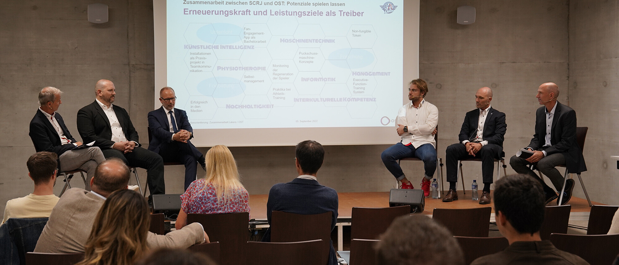 Was bedeutet Leistung? Wie treffe ich schnelle Entscheidungen? Was bedeutet Veränderung? Zu diesen Fragen tauschten sich im öffentlichen Podium an der Medienorientierung vom 5. September 2022 der St.Galler Bildungsdirektor und Lakers-Fan Stefan Kölliker, OST-Rektor Daniel Seelhofer, Lakers-Geschäftsführer Markus Bütler sowie Lakers-Profi Sandro Zangger aus. Hintergrund ist der Start der neuen Zusammenarbeit der Ostschweizer Fachhochschule mit dem Eishockey-Proficlub.