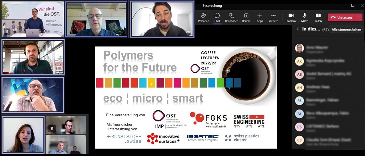 Gestartet waren die Coffee Lectures, präsentiert von Arno Maurer und Jens Ulmer, im Frühjahrssemester 2020 durch das IMP Institut für Mikrotechnik und Photonik am OST Campus Buchs, um trotz der Pandemie die aktuelle Diskussion in der Kunststoffwirtschaft und -forschung weiterzutragen. Die Serie befindet sich somit bereits im 6. Semester und erreicht jeweils etwa 60 – 70 Online-Teilnehmende aus der Schweiz und dem Ausland.