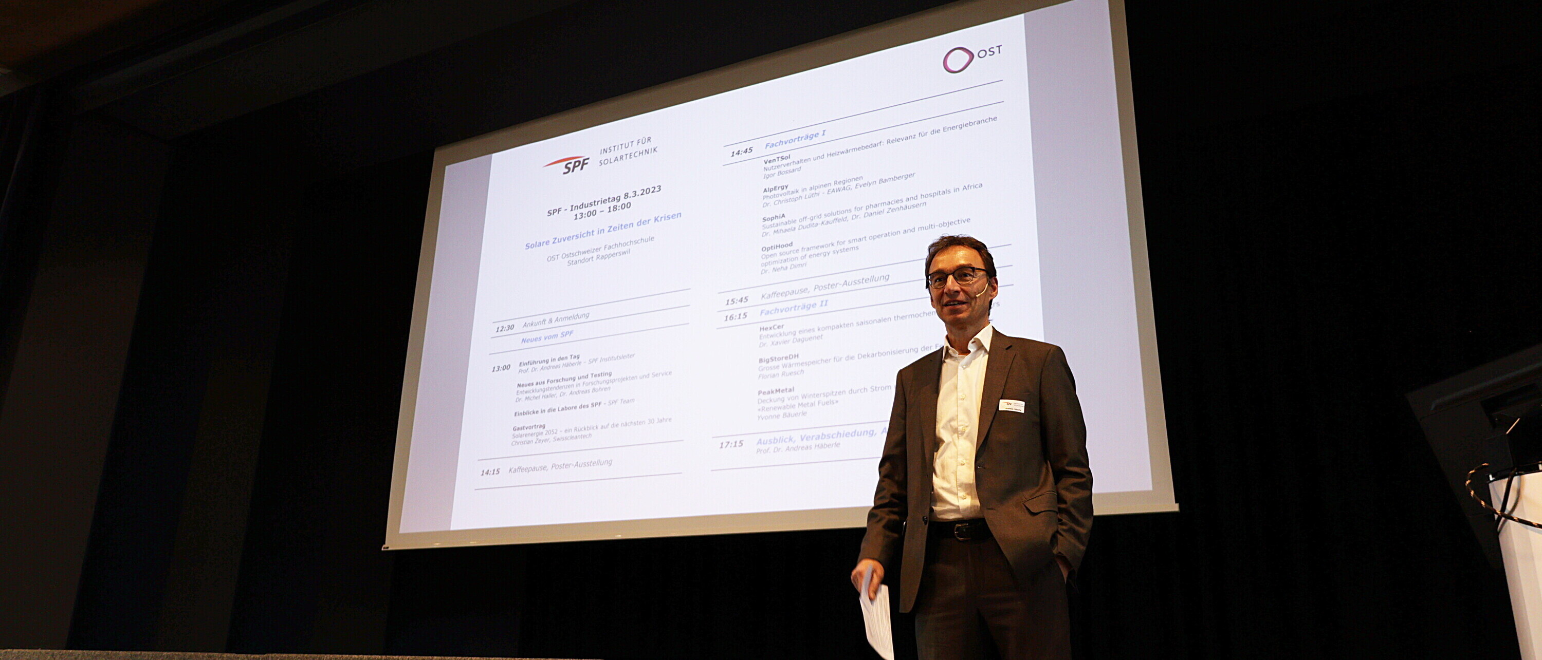 Prof. Dr. Andreas Häberle, Institutsleiter des an der OST grössten Instituts mit 50 zumeist wissenschaftlichen Mitarbeitenden, begrüsste die zahlreichen Besucherinnen und Besucher und führte in die beiden Eröffnungsvorträge aus den Bereichen Research & Testing ein.