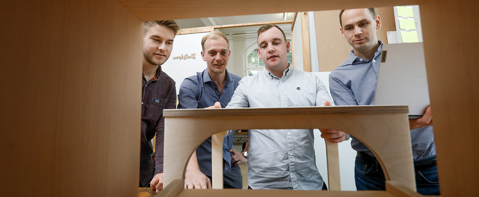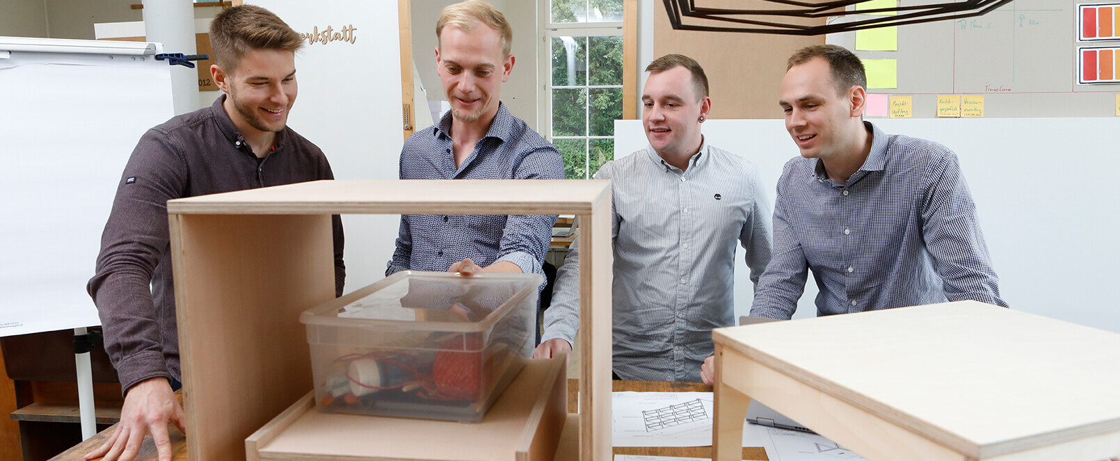 Das ist zum Beispiel ein Hocker-Regal, das flexible Arbeitsplätze im Unterricht ermöglicht. Der Industriepartner könne damit ein neues Standbein aufbauen, ist sich das Team einig. Ein anderes Team hat eine Pilzmyzel-Verpackung entwickelt, die zu 100% aus natürlichen Materialien besteht und vollständig biologisch abbaubar ist – eine erfolgsversprechende Lösung. Ein weiteres Team hat ein Modul mit eingebautem Sensor realisiert, das an Holzträgern befestigt wird und bei zu grosser Belastung Alarm schlägt. Weiter entwickelten die insgesamt acht Teams ein Velomiet-System für Unternehmen, ein Konzept für mehr Zufriedenheit bei Mitarbeitenden, einen neuartigen Trinkbecher, einen digitalen Raumgestalter sowie einen innovativen Händetrockner.
