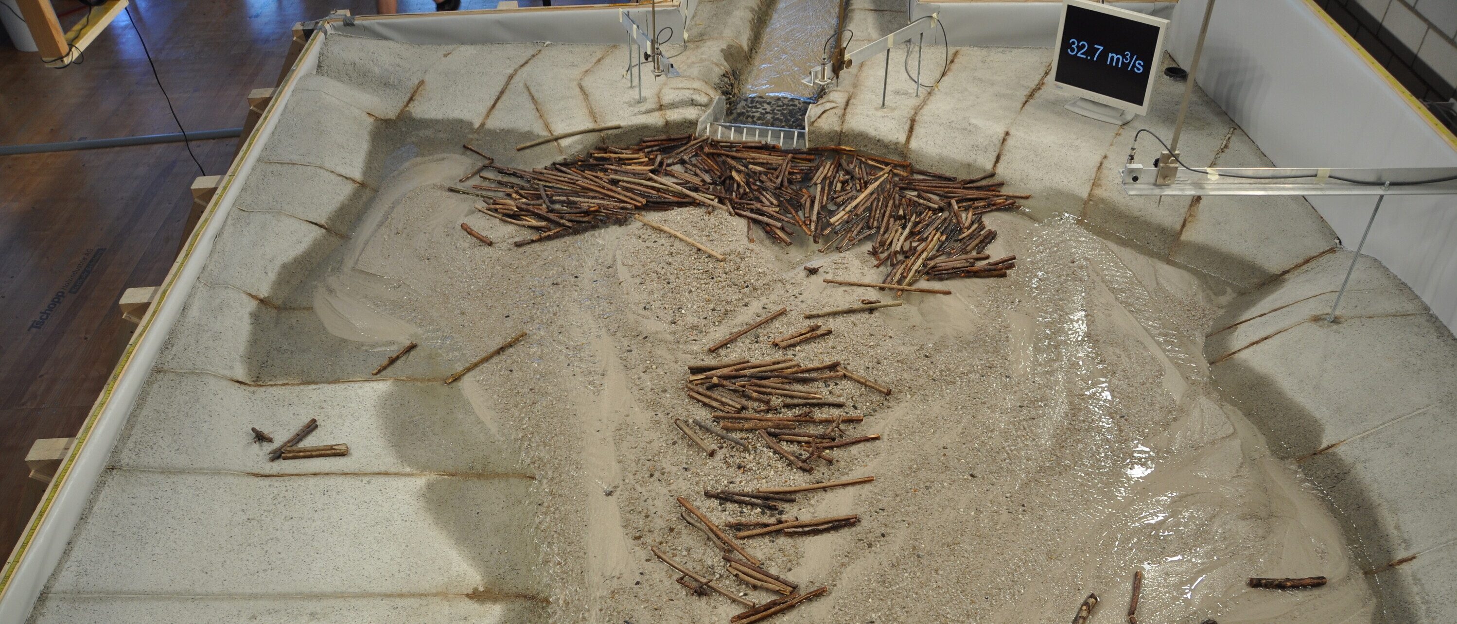 Das hydraulische Modell der Fassung Eugenisee wurde im Massstab 1:30 in Froud’scher Ähnlichkeit erstellt. Die Versuche wurde mit beweglicher Sohle sowie mit anfallendem Schwemmholz durchgeführt.