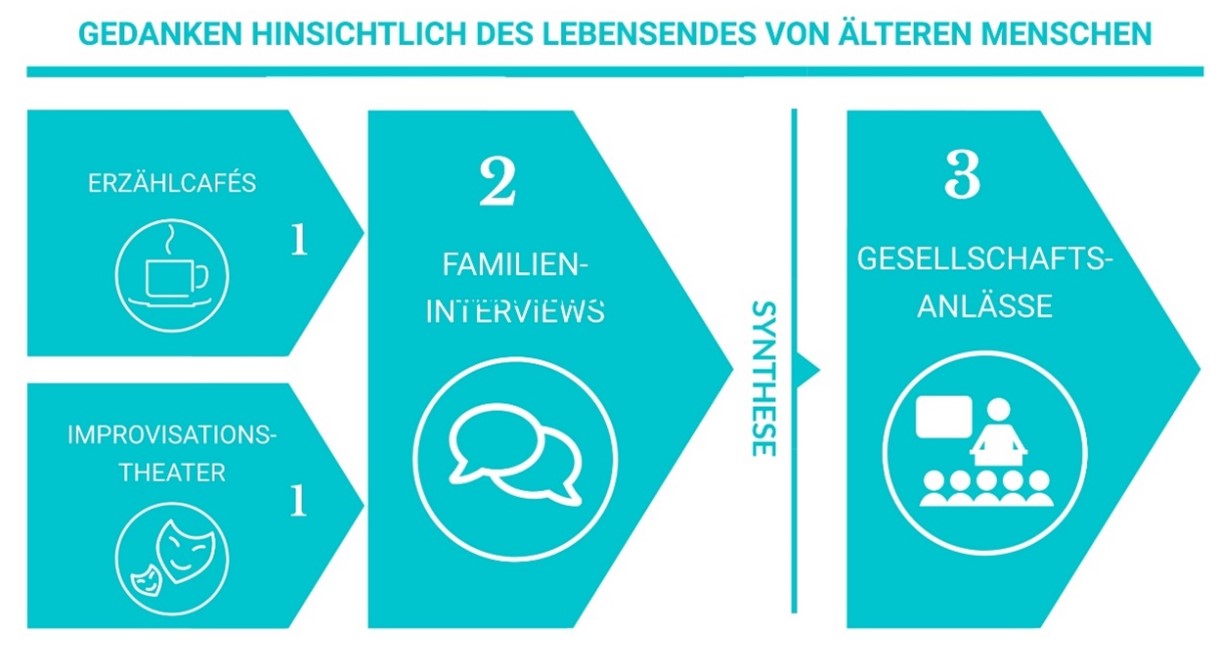 Erzählcafés und Improvisationstheater dienen einem möglichst offenen, explorativen Zugang zum Thema. Themen, die sich dabei herauskristallisieren werden in Familieninterviews vertieft. Die generierten Daten werden in einem mehrstufigen Prozess unter Einbezug relevanter Stakeholder synthetisiert. Die Ergebnisse werden im Rahmen von Gesellschaftsanlässen der Öffentlichkeit präsentiert. Dabei werden Diskussionsplattformen geschaffen, um die Ergebnisse einerseits zu validieren und gegebenenfalls weiter zu vertiefen.