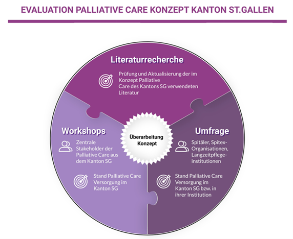 Die Evaluation und Überarbeitung des Palliative-Care-Konzepts des Kantons St.Gallen folgt einem multimethodischen Ansatz. Dieses Vorgehen umfasst die Überprüfung und Aktualisierung der im Konzept verwendeten Literatur sowie die Wiederholung der Umfrage von 2014, die Spitäler, Spitex-Organisationen und Langzeitpflegeeinrichtungen zur Palliative-Care-Versorgung einbezieht. Die gewonnenen Erkenntnisse werden anschliessend in Workshops mit zentralen Stakeholdern diskutiert und in die finale Überarbeitung des Konzepts integriert. Die wesentlichen Aspekte dieses methodischen Vorgehens sind in der nachfolgenden Abbildung dargestellt.