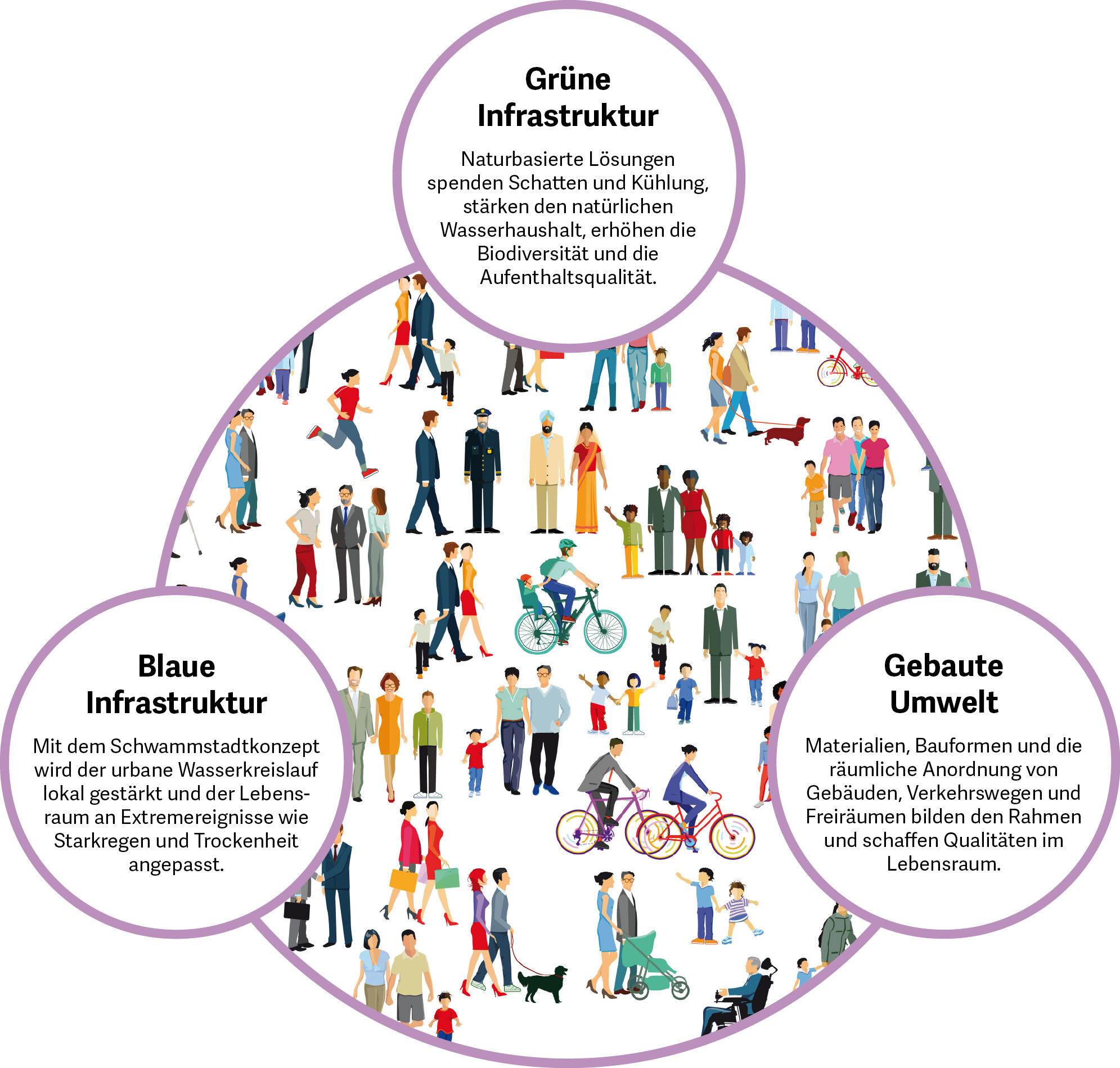 Klimaangepasste Räume müssen für alle nutzbar sein. Besonders vulnerable Gruppen benötigen kurze Wege zu Schatten, Wasser und Aufenthaltsorten, die auch bei Extremwetter funktionieren.