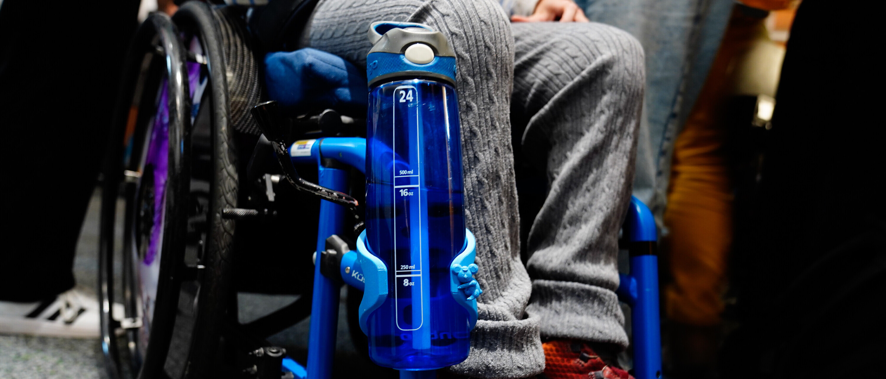 Dank der Trinkflaschenhalterung können Rollstuhlfahrerinnen und Rollstuhlfahrer bequem ihre Trinkflasche mitnehmen und haben diese griffbereit.