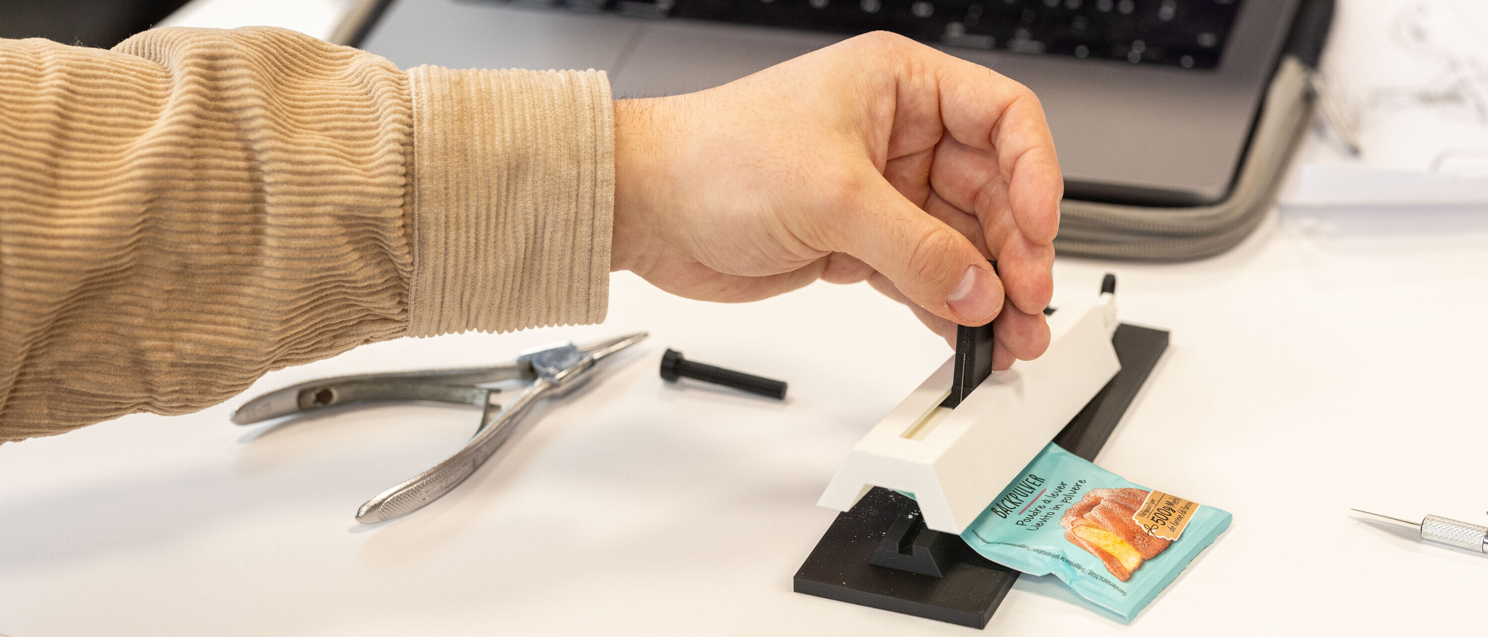 Mit diesem Standmesser können Verpackungen, z.B. von Backpulver, mit nur einer Hand geöffnet werden. (Bild: Patrick Gutenberg, HfH)