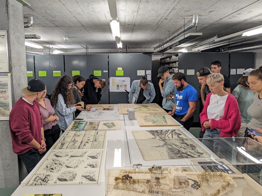 Gleich in der ersten Woche ihres neuen Studiums werden die Erstsemester im Archiv empfangen. Eine Ausstellung mit Schwerpunkt Hand- zeichnung und Plangrafik in allen Epochen zeigt ihnen die Entwicklung ihres Berufstandes ab 1860 bis 1990. Bei der Führung werden sie in die Möglichkeiten der Archivnutzung in den verschiedenen Modulen eingeführt, sie können Fragen stellen und Unterlagen ausleihen. Innerhalb der Vorlesungen von Entwurf 1 werden ihnen bestimmte Themen immer wieder anhand von Archivalien erläutert, so zum Beispiel Plangrafik und Modellbau. Die Archivalien dienen so als selbstverständliches Anschauungsmaterial im Unterricht.