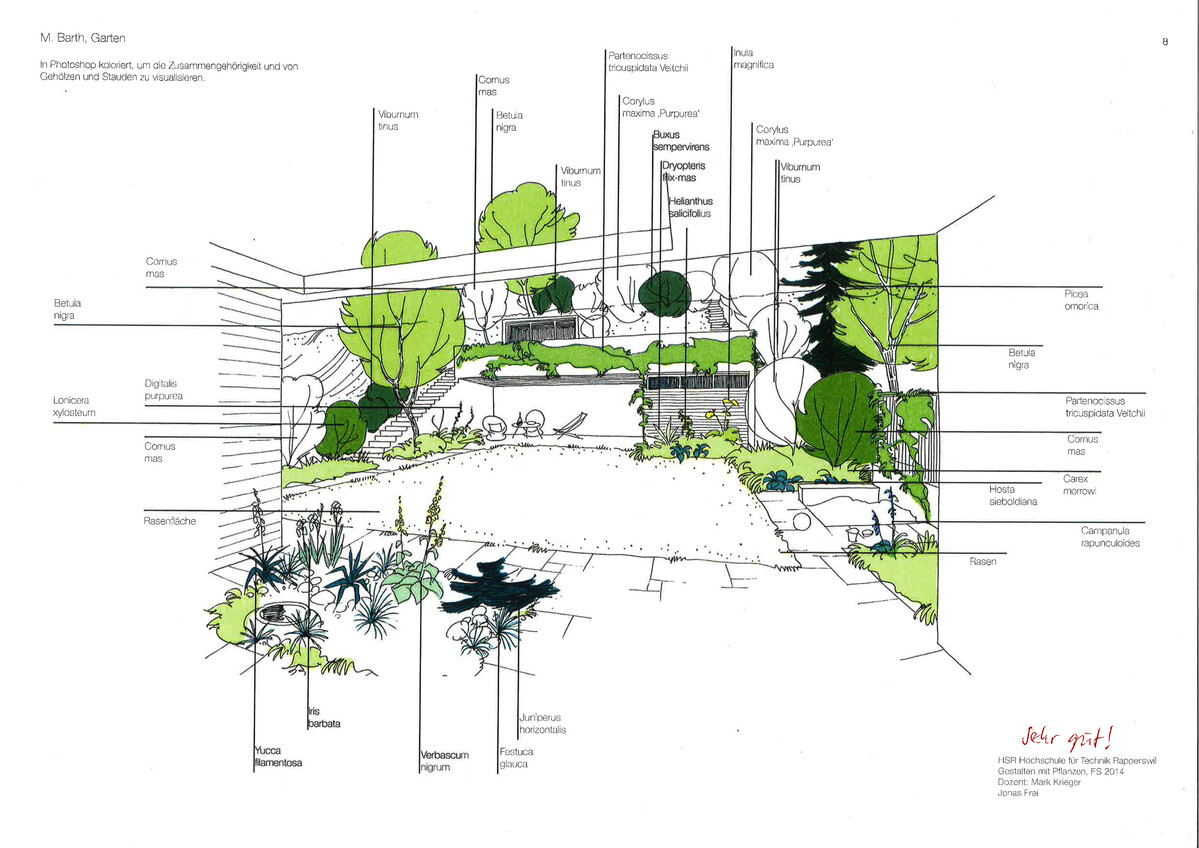 Zwei Übungen in diesem Modul beschäftigen sich mit historischen Plänen. Darstellungen von Hans Jakob Barth und Johannes Schweizer zeigen Pflanzen in so präziser Art, dass sie sich mindestens annähernd bestimmen lassen. Die Studierenden versuchen beispielsweise in der Zeichnung eines Innenhofes von Barth die Pflanzen zu bestimmen und so eine realitätsnahe Vorstellung einer Bepflanzung aus der Zeit der Nachkriegsmoderne zu entwickeln. Basierend auf solchen Studien entwerfen sie dann eine eigene Pflanzplanung, die vom studierten Vorbild inspiriert ist.
