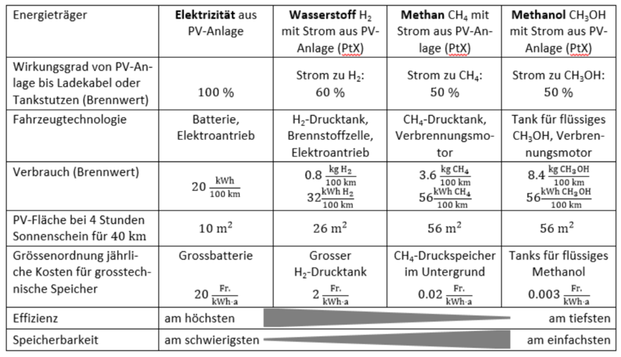 Am Beispiel des Personenwagens kann man die Vor- und Nachteile verschiedener Energieträger darstellen: Die Tabelle unten zeigt Eigenschaften von vier verschiedenen Fahrzeugtechnologien. In allen Fällen ist die Ausgangslage Strom aus einer Photovoltaikanlage (PV-Anlage), die im ersten Fall für ein batterie-elektrisches Fahrzeug verwendet wird. In den drei anderen Fällen wird der Strom in einem Power-to-X Prozess (PtX) in einen chemischen Energieträger umgewandelt: Die beiden Gase Wasserstoff H2 und Methan CH4 sowie die Flüssigkeit Methanol CH3OH. Die Fahrzeuge verwenden diese chemischen Energieträger als Energiespeicher an Bord.