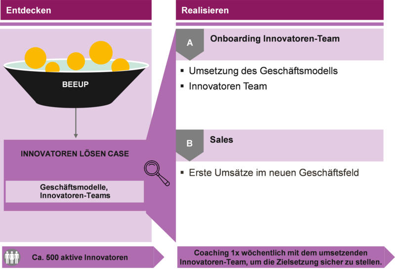 Der Prozess beginnt mit einem sogenannten Case: einer realen Unternehmenssituation, ähnlich wie eine MBA-Fallstudie – aber ohne vorgegebene Lösung. Der Case beschreibt die Geschichte, Stärken und aktuellen Herausforderungen einer Unternehmung. Als Beispiel haben wir die Plattform BeeUp – ein Spin-Off unseres Instituts – genutzt.