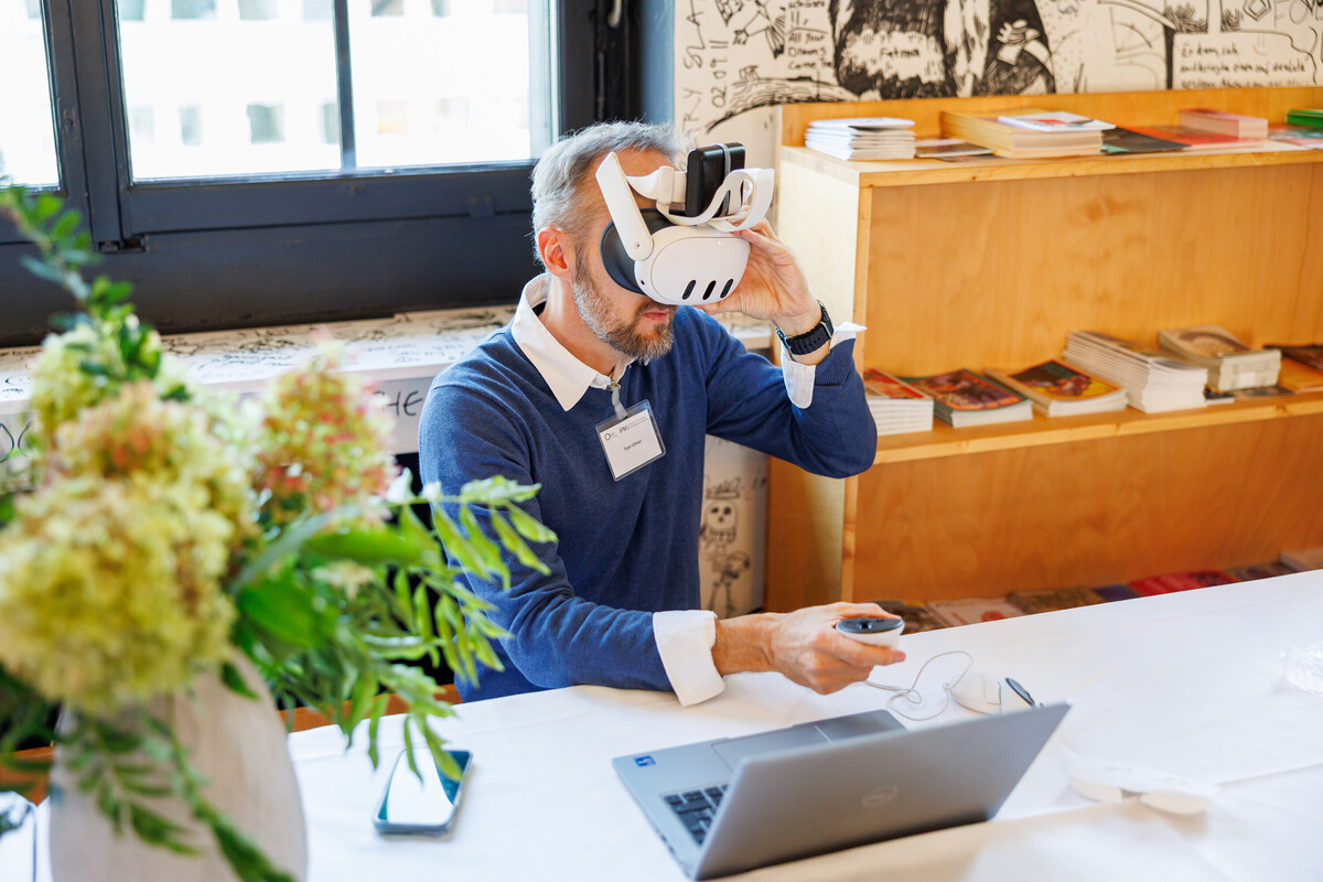 Mehrere Prototypen aus laufenden Forschungsprojekten waren für die Gäste aufgebaut. Dr. Christoph Baumgarten, Dr. Wolfgang Groher und Tom Ulmer luden zum Ausprobieren ein und informierten über die Entwicklung und Potenziale der Exponate.