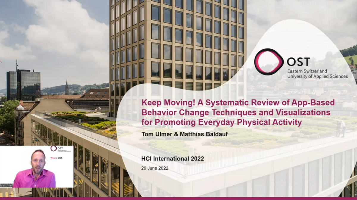 Ebenfalls aus dem IPM-Kompetenzfeld User Experience Design stellte Tom Ulmer einen systematischen Überblick über bisher in Forschungsarbeiten eingesetzte Behavior Change-Techniken in Bewegungs-Apps auf der HCI International (ursprünglich Göteborg, Schweden, kurzfristig virtuell) vor. Die Arbeit mit dem Titel «Keep Moving! A Systematic Review of App-Based Behavior Change Techniques and Visualizations for Promoting Everyday Physical Activity» ist bei Springer erschienen.