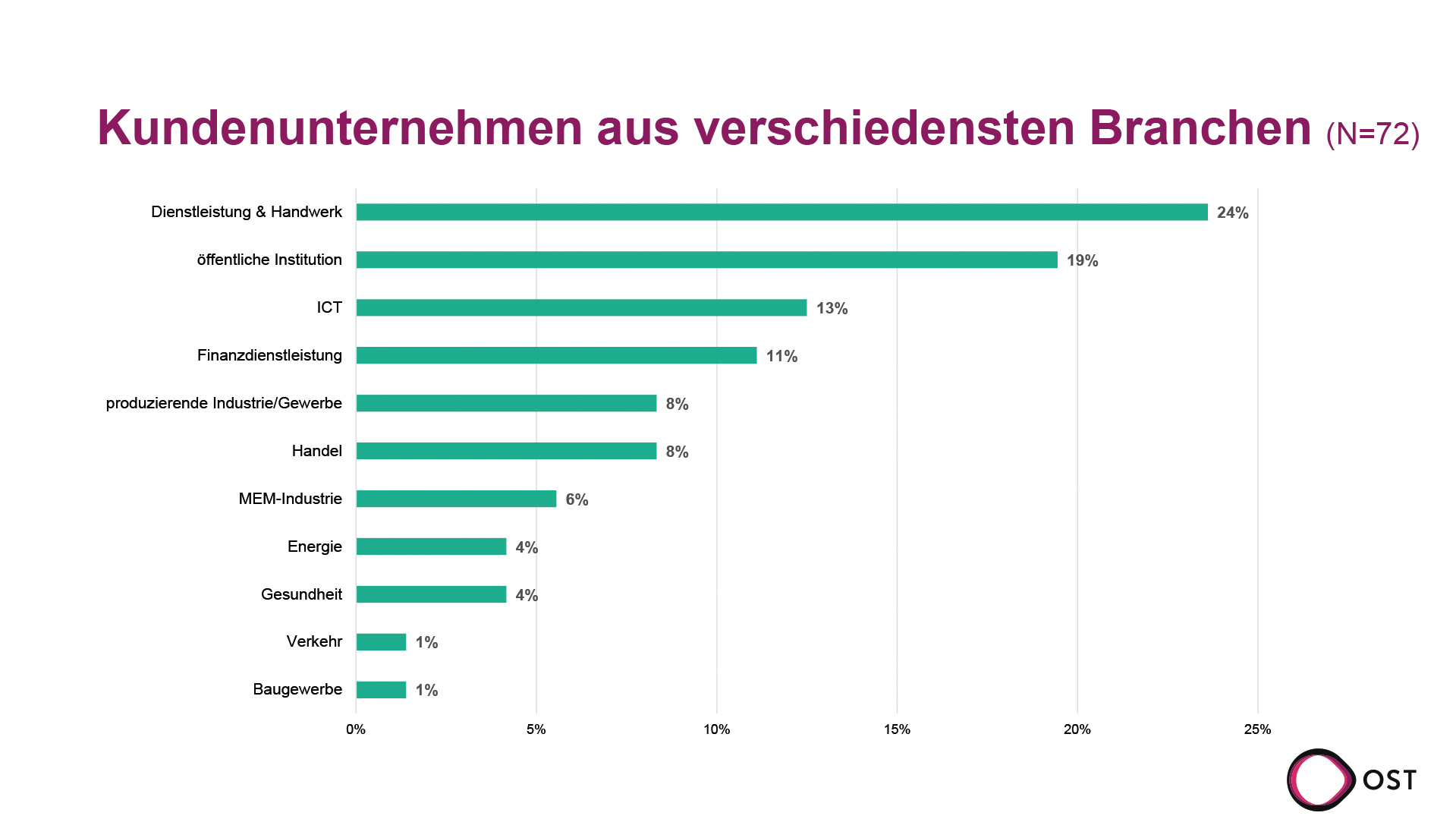 Die 72 Projekte verteilen sich auf Unternehmen aus unterschiedlichsten Brachen. Den grössten Anteil bilden «Dienstleistung & Handwerk», gefolgt von «öffentlichen Institutionen» und der ICT-Branche. Auch Finanzdienstleister, wie Banken, Treuhand und Versicherungen, die «produzierende Industrie und Gewerbe» sowie der Handel sind stark vertreten.