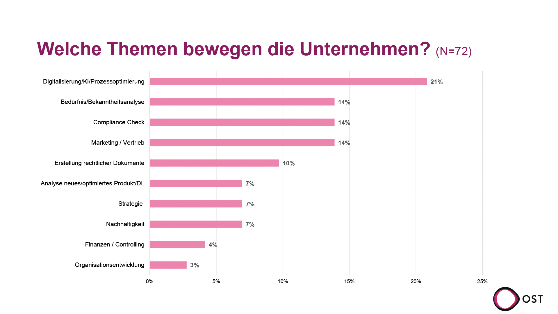 Ebenfalls stark vertreten sind Bedürfnis- und Bekanntheitsanalysen, Compliance Checks sowie Projekte in Marketing und Vertrieb. Diese Themen verdeutlichen, dass Unternehmen sowohl ihre Marktposition als auch regulatorische Anforderungen verstärkt im Blick haben.