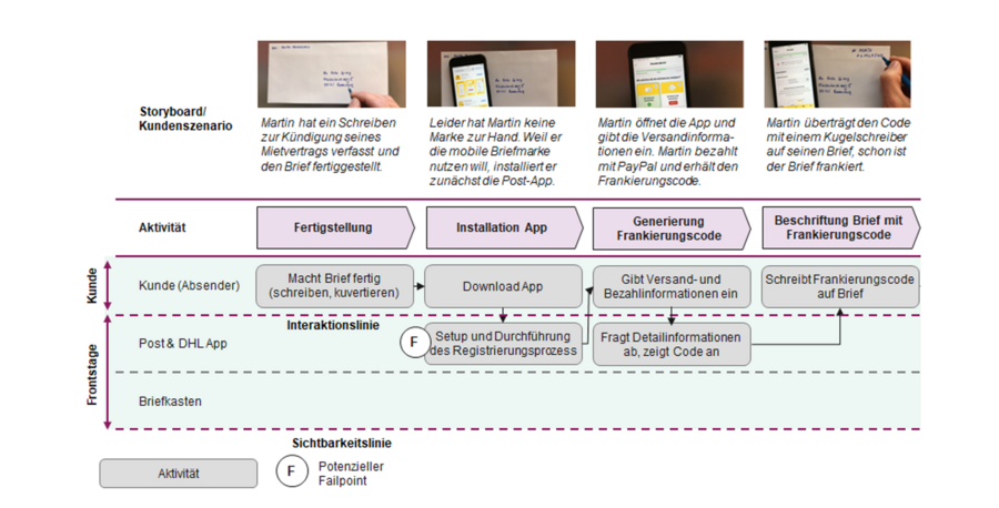 Servicedesign-Workshops kommen sowohl bei der Entwicklung neuer Services als auch bei der Überarbeitung bestehender Services zum Einsatz. Es wird empfohlen, auch Kunden in solche Workshops einzubeziehen (Patrício et al., 2018). Die Visualisierung von Servicedesigns erfolgt durch Prozessdarstellungen wie Ablaufdiagramme und Service Blueprints. Letztere Darstellungsform ist ein erweitertes Ablaufdiagramm, welches auf die Kundenperspektive und die Interaktion zwischen Kunde und Serviceanbieter fokussiert (s. Beispiel unten). Zudem werden auch Storyboards, Kundenszenarios und Wireframe-Skizzen genutzt, die einzelne Schritte bildlich darstellen und beschreiben (Teixeira et al., 2017). Bei digitalen Services wird zunehmend User Experience-Software eingesetzt, die es ermöglicht, Prototypen von Benutzeroberflächen zu erstellen.