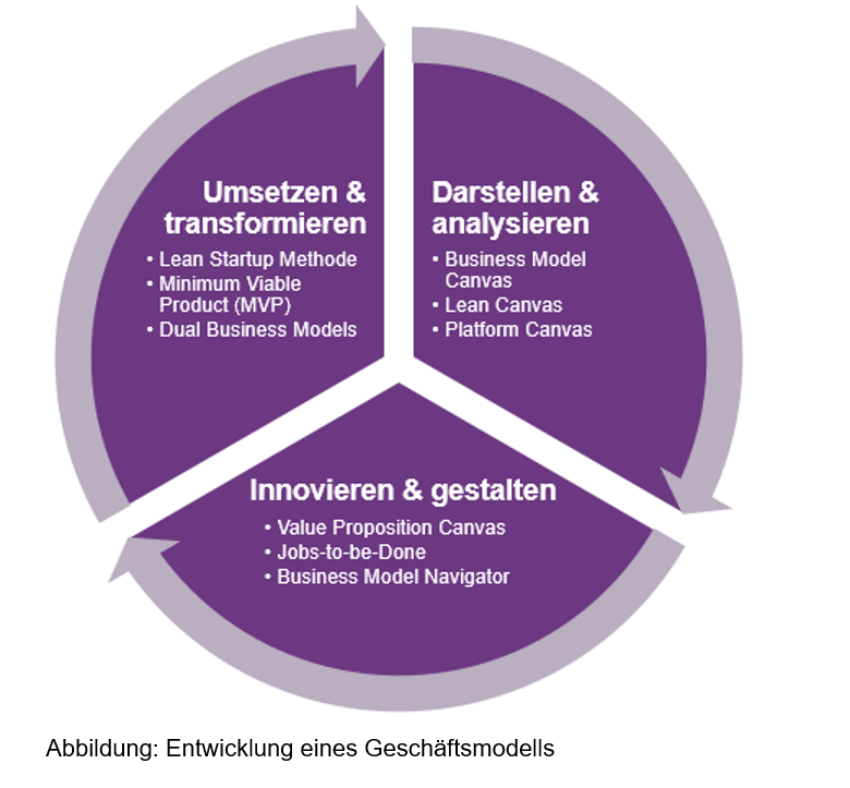 Für jede dieser Phasen stehen unterschiedliche Methoden und Werkzeuge zur Verfügung. Strukturierungsansätze wie das Business Model Canvas, Lean Canvas oder Platform Canvas helfen dabei, Geschäftsmodelle übersichtlich darzustellen. Instrumente wie das Value Proposition Canvas oder das Jobs-to-be-Done-Konzept unterstützen die Entwicklung kundenzentrierter Angebote. Strategische Werkzeuge wie die Value Curve oder Blue Ocean Strategy fördern die Identifikation von Innovationspotenzialen und Differenzierungsmöglichkeiten. Der Business Model Navigator bietet einen systematischen Ansatz zur Entwicklung neuer Ansätze und nutzt hierfür bereits bestehende Geschäftsmodell-Muster, die auf den eigenen Unternehmenskontext übertragen werden. Methoden wie Lean Startup und die Entwicklung eines Minimum Viable Product (MVP) ermöglichen es, neue Ideen schnell zu testen und iterativ weiterzuentwickeln.