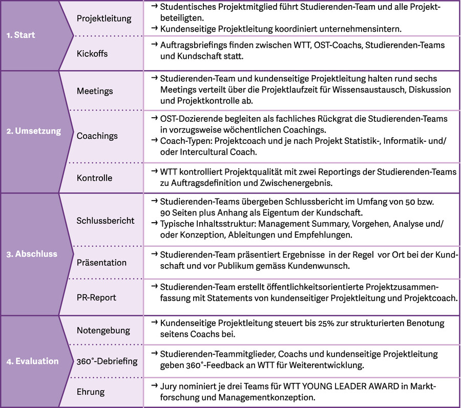 Bei der Projektzuteilung an die Studierendenteams berücksichtigt die WTT im eigenen Interesse an einer hohen Leistung und Motivation, dass die voraus abgefragten Präferenzen der Studierendenteams grösstmöglich mit jenen der Projektthemen und Kundschaften übereinstimmen.