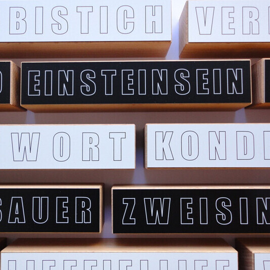 Vitoria Pinto betreibt in der alten Mühle in Pfäffikon ZH ihr Atelier, das sie "Kunstbetrieb" nennt. Die Künstlerin ist eine Sprachakrobatin und arbeitet konzeptionell mit dem Medium Sprache. Die bewusst puristisch gestalteten Sprachtafeln und Installationen verhelfen den Wörtern und Sätzen zu einem Eigenleben. Die Texte treten in einen Dialog zum Umfeld, zur Situation, zum Ort und zum verunsicherten, oft auch amüsierten Betrachter. In dessen Kopf offenbart das Gesehene eine neue Bedeutungsebene und verwandelt sich so in eine Art neues Werk. Die Künstlerin arbeitet bevorzugt raumbezogen und ortsspezifisch. An der längsten Wand der Galerie hängen vierzehn A0-Plakte aus der 294 Sätze umfassenden Textarbeit "Diese Welt wird dem toten Hasen nicht erklärt". Auf jedem Poster stehen jeweils acht (die liegende Acht ist das Zeichen für eine Endlosschlaufe) Wörter untereinander geschrieben. Aneinandergereiht bilden sie einen Satz. Obwohl jeder Buchstabe etwa 10 cm hoch ist, können die Wörter nur schwer entziffert werden; der ganze Text wurde nämlich mit weisser Farbe übermalt. "Weissen" nennt die Künstlerin ihre Technik, die sie hier nicht zum ersten Mal verwendet. Was in einem zeitaufwändigen Prozess entstanden ist, wird biltzschnell fast wieder ausgelöscht.