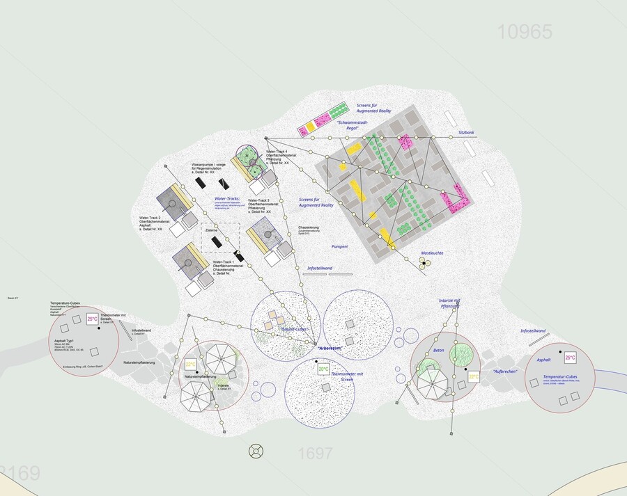 Der Ausstellungsbereich ist in Form einer idyllischen Oase im Freien konzipiert. Revitalisierte Böden, bereichert mit einer artenreichen Vegetation, erschaffen einen Ort, der als interaktiver Chatroom fungiert und die Besucher und Besucherinnen zu sinnvollen Gesprächen anregt. Führungen, Themenpfade, Workshops für Schulklassen und «Meet the Scientists»-Veranstaltungen verstärken den interaktiven Dialog und bieten dem Publikum vielfältige Möglichkeiten, sich mit den Themen der Schwammstadt und Biodiversität auseinanderzusetzen.