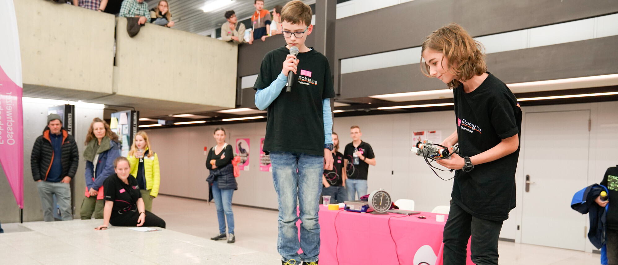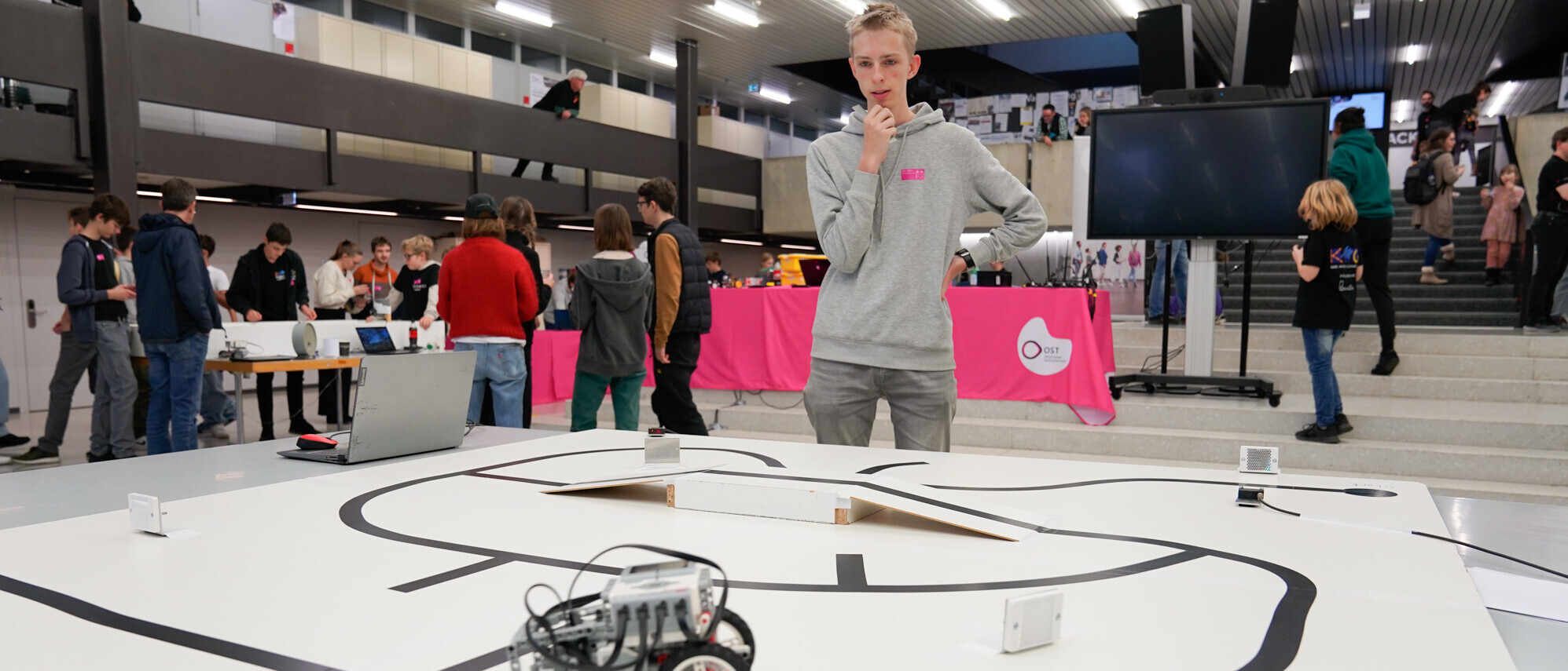 Notiert werden die Ergebnisse von jungen Schiedsrichtern an den Tischen. Sie studieren alle an der OST, die meisten Electrical and Computer Engineering (ECE, früher Elektrotechnik). Der Studiengang Electrical and Computer Engineering ist Veranstalter der RobOlympics. Robotik und intelligente Systeme sind Teil der Ausbildung für angehende Elektroingenieurinnen und -ingenieure. «Wir möchten mit den RobOlympics möglichst viele junge Menschen auf spielerische Art für Technik begeistern und so den Ingenieurnachwuchs langfristig fördern», sagte Andreas Breitenmoser, Elektrotechnik-Professor an der OST und Mitorganisator der RobOlympics. «Was die Jugendlichen für die RobOlympics lernen, zählt zu den Zukunftskompetenzen. Roboter-Technologie und Künstliche Intelligenz sind zunehmend in unserem Alltag präsent. Angehende Ingenieurinnen und Ingenieure lernen bei uns an der OST, die technologische Zukunft mit all ihren Herausforderungen aktiv mitzugestalten.»