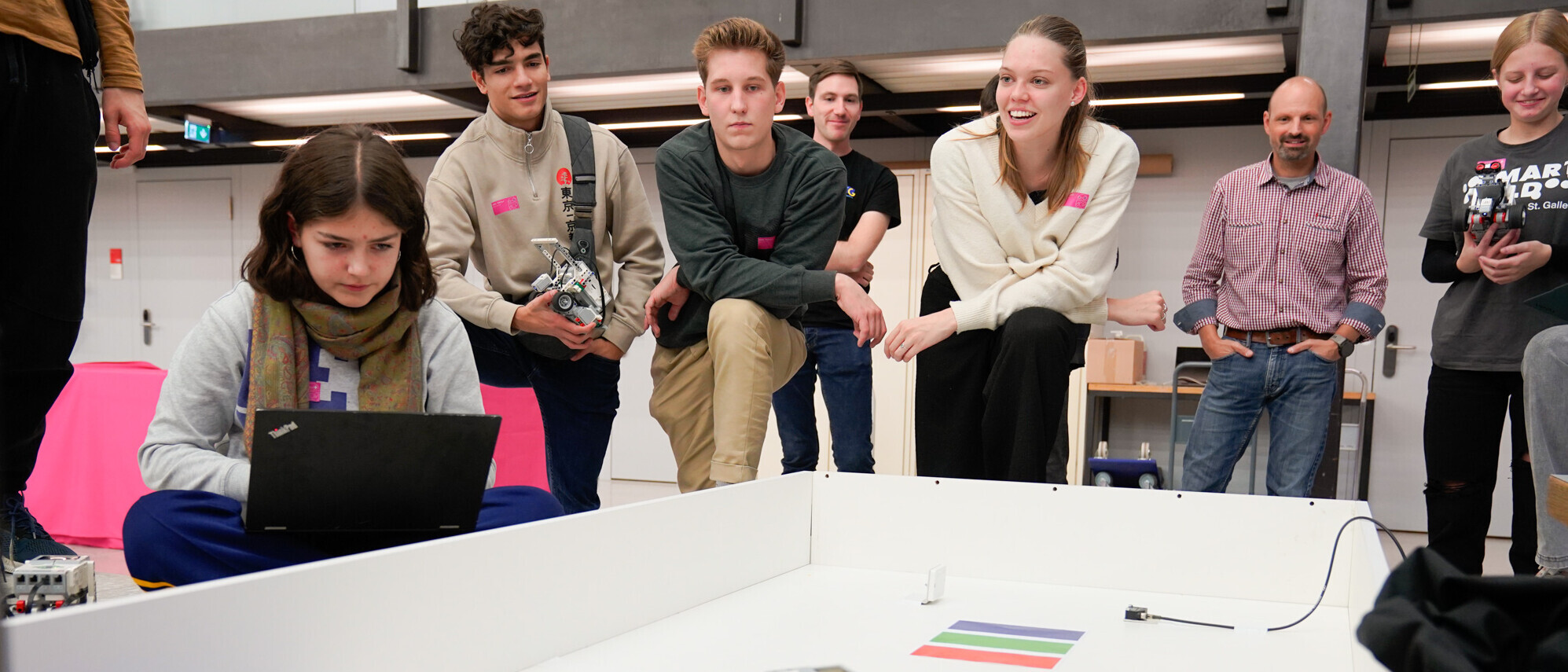 Die Uhr läuft, die Linie bis ans Ziel ist noch lang: Der Roboter vom Team «Roboter Brigade» folgt der schwarzen Linie auf dem Tisch, biegt aber an der falschen Stelle ab – und fährt in die Sackgasse. Zwei Mädchen aus dem Team diskutieren, programmieren ihren Roboter um, setzten ihn erneut auf die Linie. Noch sind es erst Probeläufe, doch bis zum Wettkampf sind es nur noch wenige Stunden. Wochenlang haben die Schülerinnen und Schüler an ihren selbstgebauten Robotern gearbeitet und sie für die RobOlympics, die Olympischen Spiele für Roboter, vorbereitet. Den letzten Schliff können sie erst vor Ort, auf dem Originalparcours machen. Es liegt Wettkampf-Atmosphäre in der Luft.