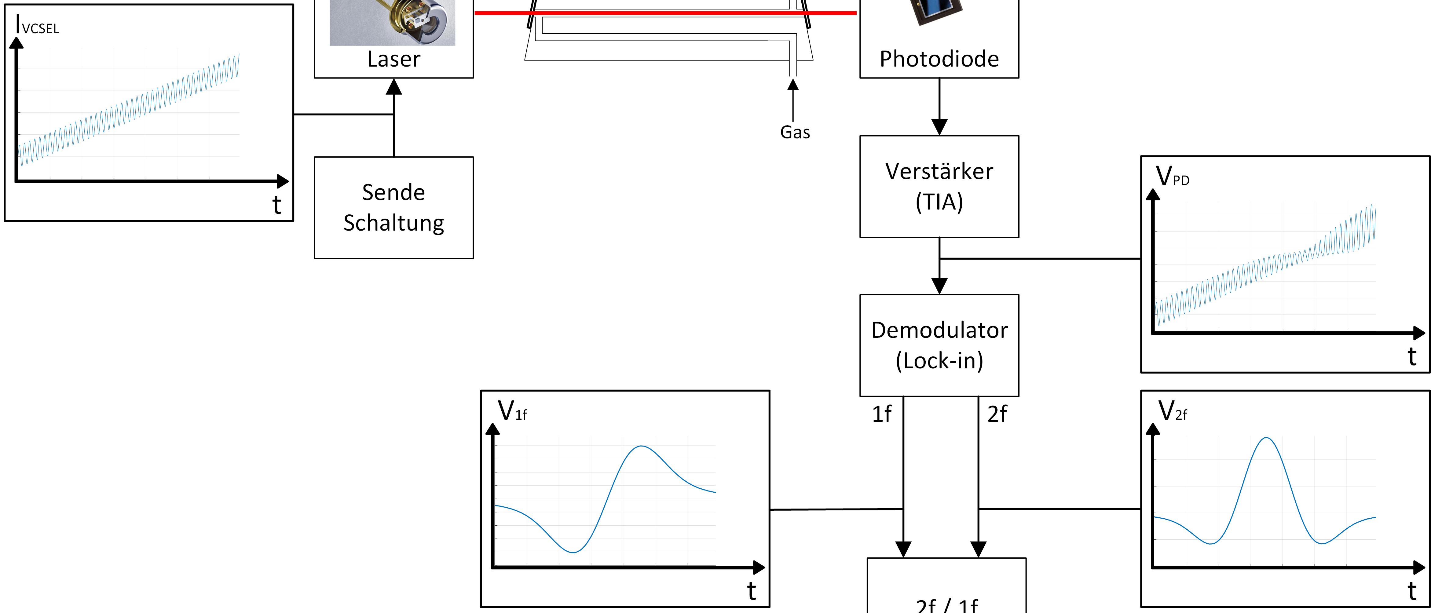 Die Atemgasanalyse stellt hohe Anforderungen an die Genauigkeit (0.03%Vol) und Ansprechzeit (40ms) aller Gasmessungen. Daher wurden für die O2, CO2 und SF6 Messung jeweils ein optischer Sensor mit der kleinstmöglichen Messstrecke, basierend auf der Wellenlängenmodulations-spektroskopie bzw. auf der nicht-dispersiven Infrarotspektroskopie eingesetzt. Beide Messprinzipien beruhen auf der Tatsache, dass Licht einer bestimmten Wellenlänge von den jeweiligen Gasmolekülen absorbiert wird. Während bei der nicht-dispersiven Infrarotspektroskopie aus einem Breitband Infrarotstrahler der spezifische Wellenlängenbereich mit einem optischen Bandpass herausgefiltert wird, setzt man bei der Wellenlängenmodulationsspektroskopie einen schmalbandigen Laser ein. Die Wellenlänge des Lasers kann über den Laserstrom moduliert werden. Liegt die Wellenlänge des Lasers im Bereich der Absorptionslinie des Gases, so führt die Absorption zu Verzerrungen, welche abhängig von der Gaskonzentration sind. Die Qualität der Gasbestimmungen ist mit der eines Massenspektrometers vergleichbar.