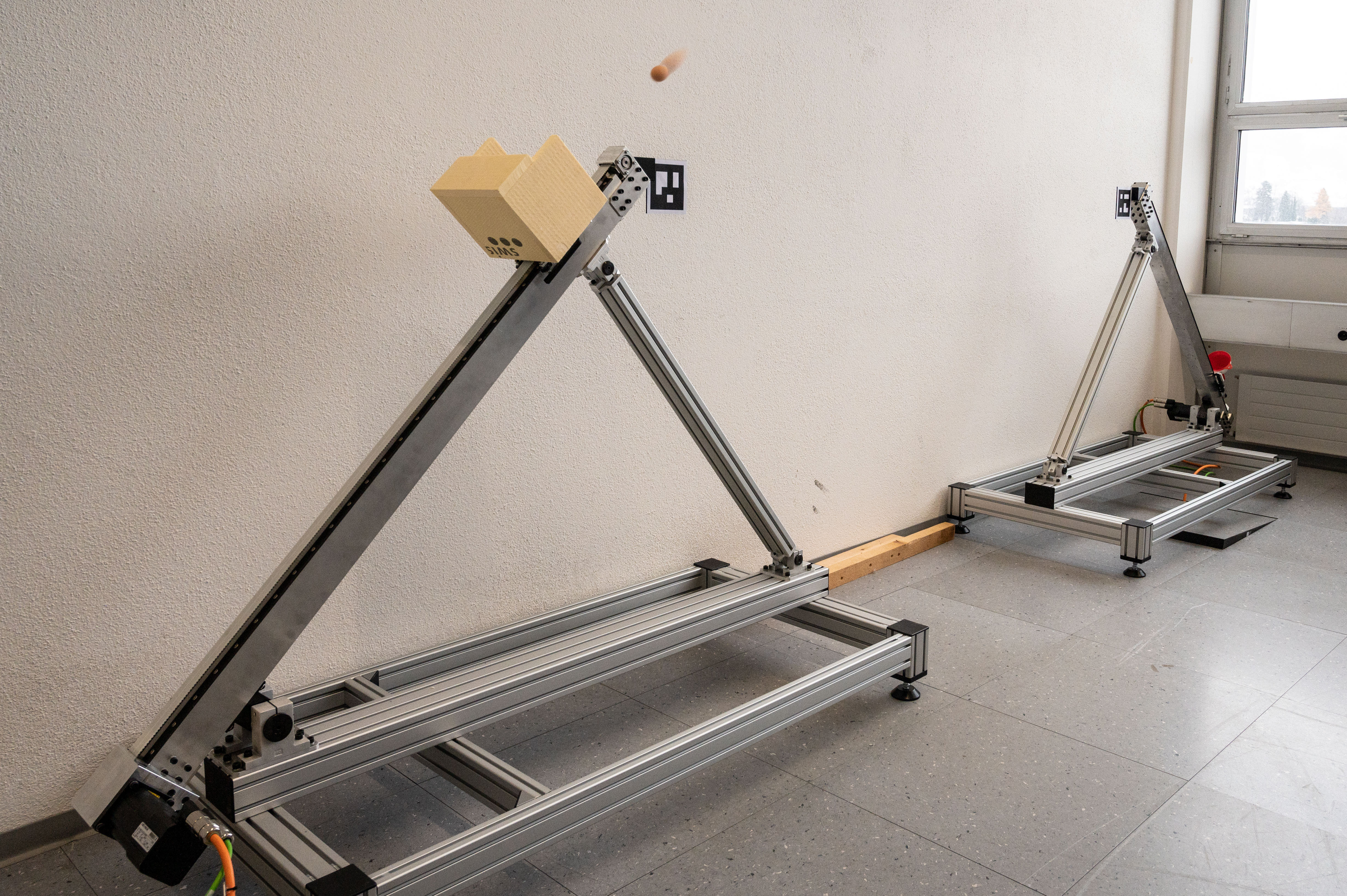Zwei Rampen, auf der einen Seite ein Konus, auf der anderen ein Fangbehälter: Was simpel aussieht, ist die Basis für eine Innovation: In 20 Sekunden wirft der Throwbot sechs rohe Eier 3.5 Meter weit, die Resultate der ersten Tests sind vielversprechend. «Wenn Gegenstände durch die Luft transportiert werden könnten, gäbe es keine Förderbänder mehr, welche die Produktionsstrassen limitieren», erklärt Jonas Frei, Projektleiter und Wissenschaftlicher Mitarbeiter am EMS, Institut für Entwicklung Mechatronischer Systeme am OST-Campus Buchs.