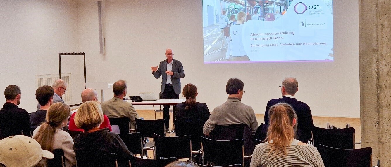 Über zwei Semester haben sich die Studierenden des Studiengangs Stadt-, Verkehrs- und Raumplanung mit praxisnahen Aufgaben in der Stadt Basel befasst. Exemplarisch für die vielen bearbeiten Studienprojekte aus allen Semestern wurde an der Abschlussveranstaltung die Gebietsentwicklung im Osten Basels, die Umgestaltung der Schwarzwaldallee, ein städtebauliches Entwicklungskonzept für Basel sowie ein Verkehrskonzept für Klybeck/Kleinhüningen von den Studierenden präsentiert. Die vorgestellten Arbeiten wurden jeweils von den Dozierenden eingeführt. Das Bild zeigt den Kantonsplaner der Stadt Basel Martin Sandtner bei der Begrüssung.