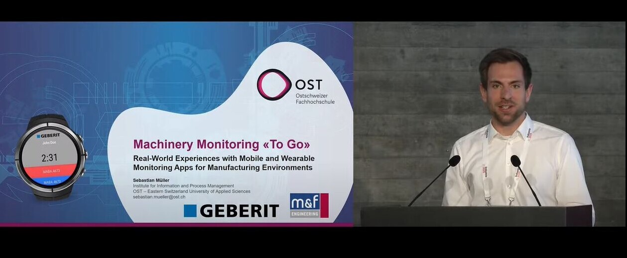 Sebastian Müller vom Institut für Informations- und Prozessmanagement erklärte, wie mit einem Smartphone oder einer Smartwatch Maschinen überwacht werden können – quasi ein «Maschinenmonitoring To Go». Prof. Dr. Daniel P. Politze vom Institut für Produktedesign, Entwicklung und Konstruktion (IPEK) gab einen Einblick, wie Knowledge Graphs im Gebäudemanagement Anwendung finden. René Pawlitzek vom Institut für Ingenieurinformatik präsentierte an der Tagung einen Experimentierkasten für die Schnittstelle zwischen dem «Internet der Dinge» (IoT) und Industrie 4.0. Mit einer digitalen Plattform, die transparent die Vorhersage des Trinkwasserverbrauchs in einem trockenen Sommer erlaubt, befasste sich das Referat von IPEK-Forscher Raphael Jud. Und das Team um Petra Kugler und Helen Vogt vom Institut für Unternehmensführung erläuterte die Erfolgsfaktoren für Data Sharing in industriellen Ecosystemen.