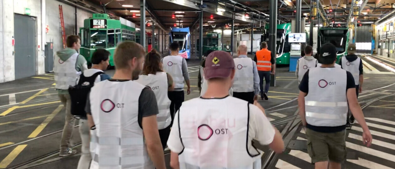 Abgeschlossen wird die erste Semesterwoche mit einer Exkursion nach Basel als neue Partnerstadt. Erstmalig findet die Exkursion mit allen drei Jahrgängen gemeinsam statt. Nach einem Auftakt am Morgen im Museum Kleines Klingental besuchen die Studierenden dann einige der sieben Posten, an denen die Dozierenden Beobachtungen und Aufnahmen begleiten oder Besichtigungen organisieren. So wird für das grosses Studienprojekt Raumentwicklung das Tramdepot Klybeck besichtigt, für das die Studierenden des fünften Semesters einen neuen Standort suchen (siehe Bild).