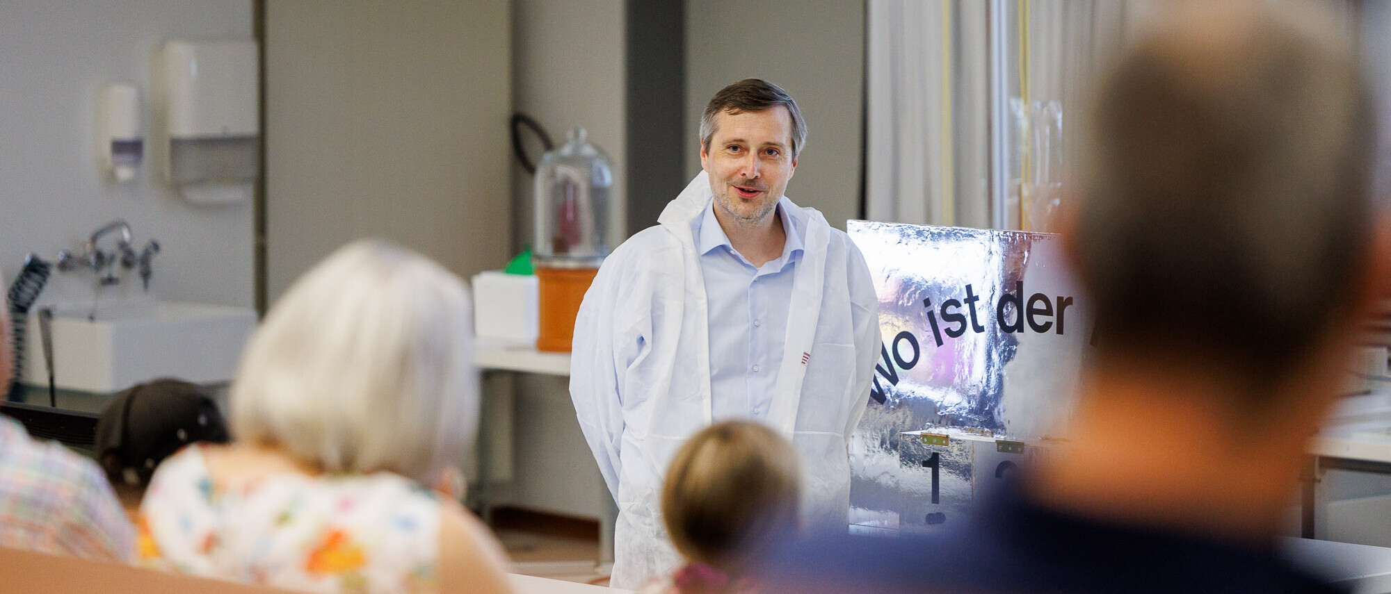 Dem Thema Film und Hollywood war auch der Vortrag «Wissenschaft trifft auf Spielfilm» gewidmet. Helden wie James Bond wurden einer Art Faktencheck unterzogen. Beispielsweise mit der Frage, ob es möglich ist, über Wasser zu gehen. Das erstaunliche Ergebnis: unter den richtigen Bedingungen, ja. Der Beweis wurde gleich live erbracht – barfuss, in einem Becken und Wasser, das mit Stärke angereichert war. Andere Vorträge zum Thema Fotovoltaik und Wärmepumpen beantworteten viele praktische Fragen.