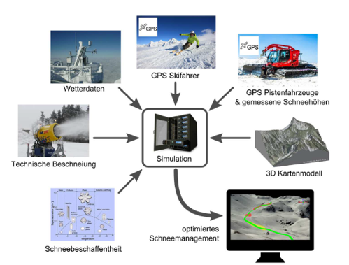 Im Projekt wird ein Simulationsmodell erstellt, in welchem Daten aus unterschiedlichen Quellen zusammengefasst werden. Aufgrund von häufig befahrenen Stellen auf der Piste, Wetterbedingungen und weiteren Daten kann aus Differenz von SOLL- und vorhergesagter IST-Schneehöhe berechnet werden, wo auf der Piste welche Schneemenge benötigt wird.