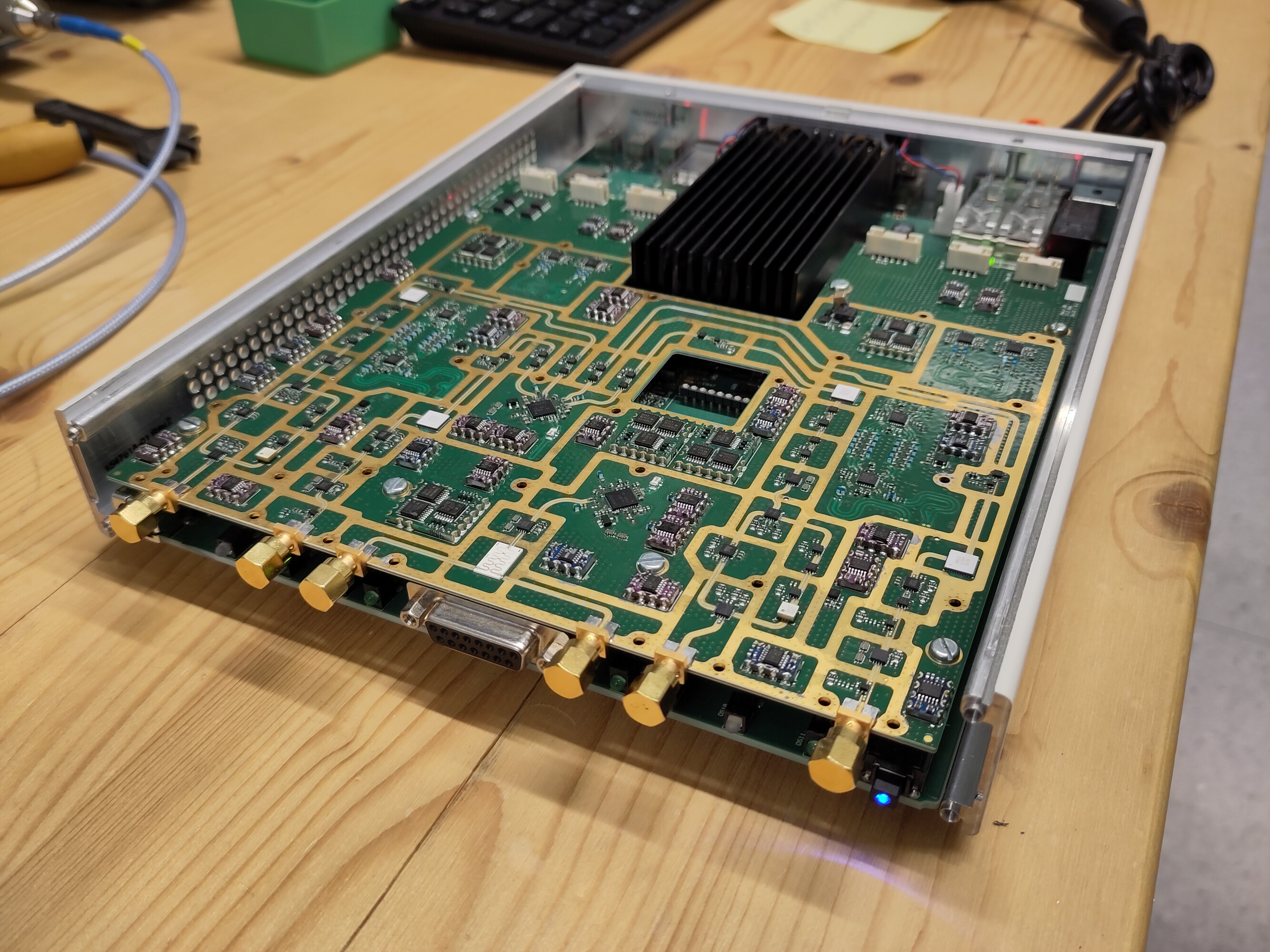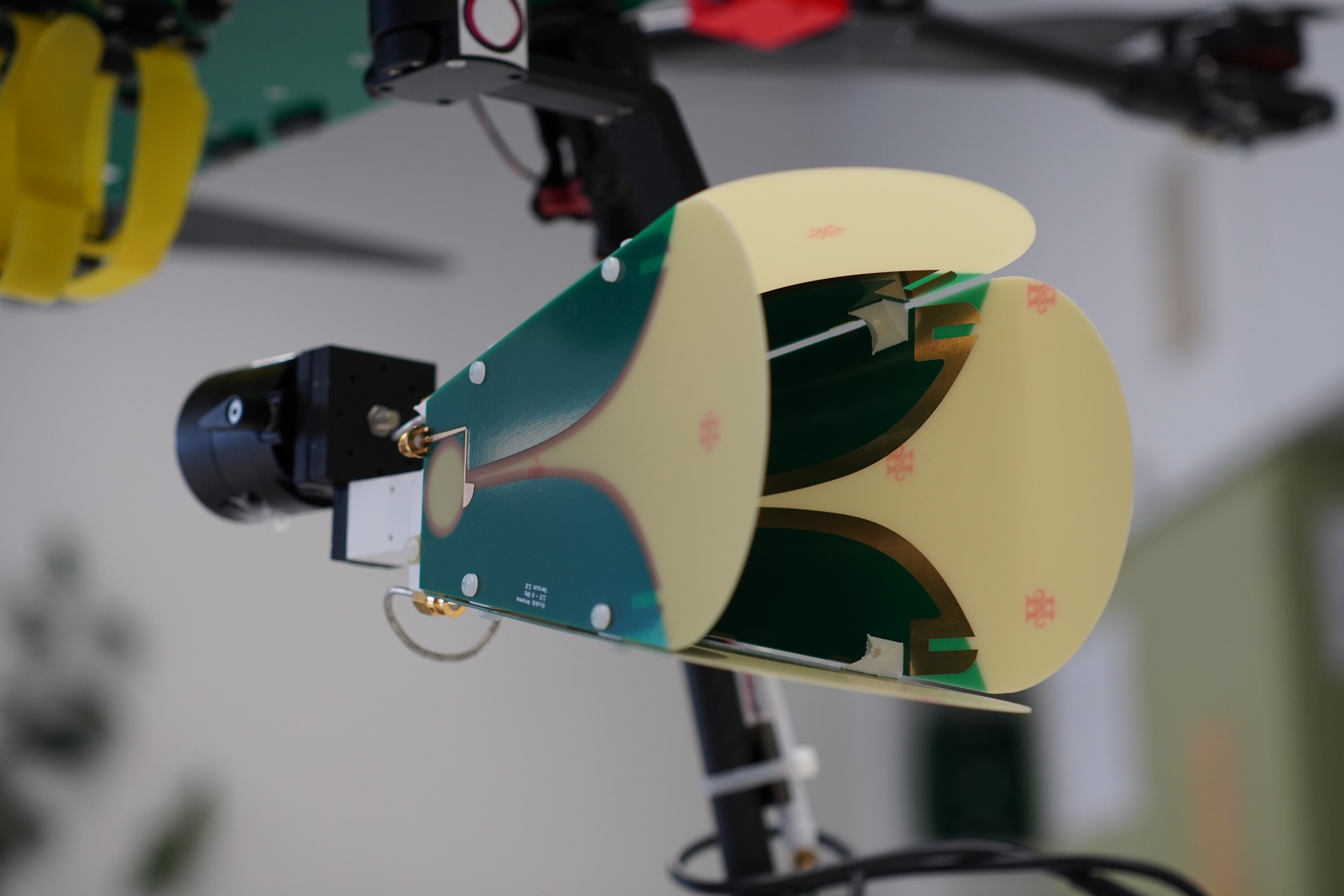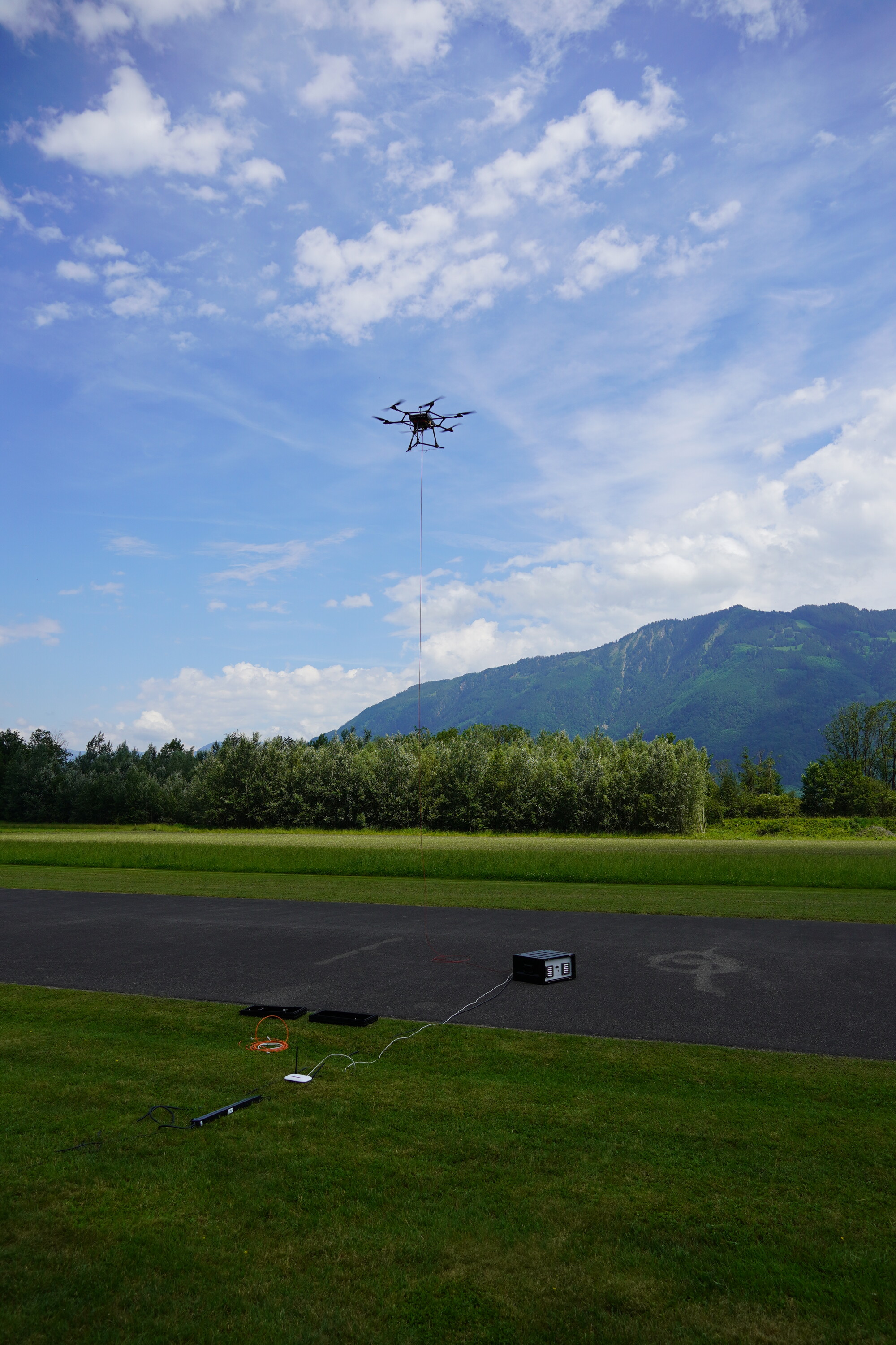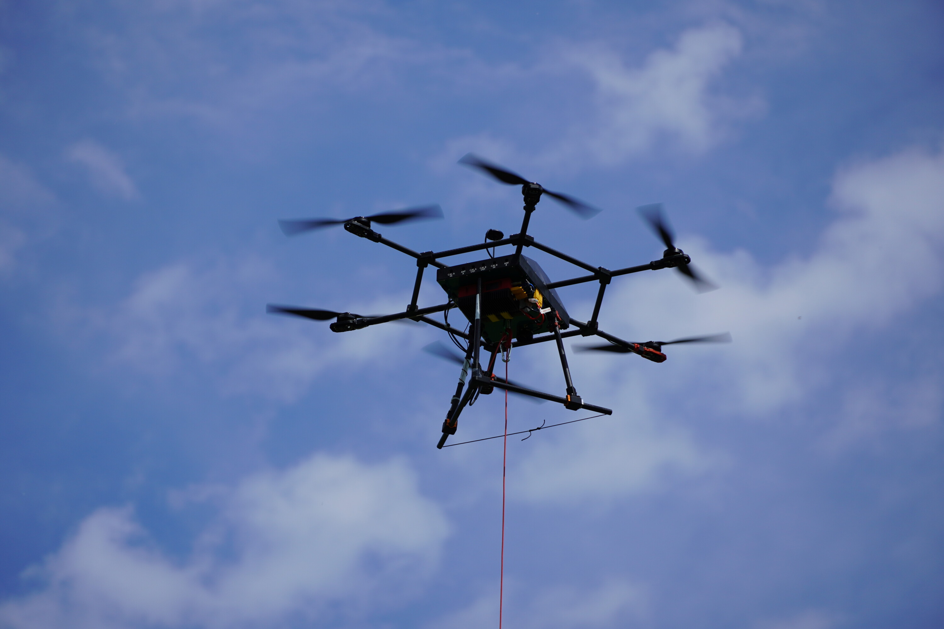 Zur Überwindung dieser Hürden wurde eine gewichtsoptimierte, kabelgebundene Drohnenplattform entwickelt, die für ein maximales Startgewicht von über 10 kg ausgelegt ist. Kern der Nutzlast ist ein neu entwickeltes Breitband-Hochfrequenzfrontend für ein Software Defined Radio (SDR) im Bereich von 2 bis 12 GHz, ergänzt durch eine ultraleichte Antenne (2–6 GHz) mit hoher Effizienz. Die dauerhafte Luftpräsenz wird durch ein leistungsstarkes Tethering-System gewährleistet, das die Drohne kontinuierlich mit 2,4 kW versorgt. Gleichzeitig sichert eine integrierte 10G-Glasfaserverbindung den schnellen Datentransfer zum Server am Boden, wodurch eine nahtlose Echtzeitverarbeitung der Signale ermöglicht wird.