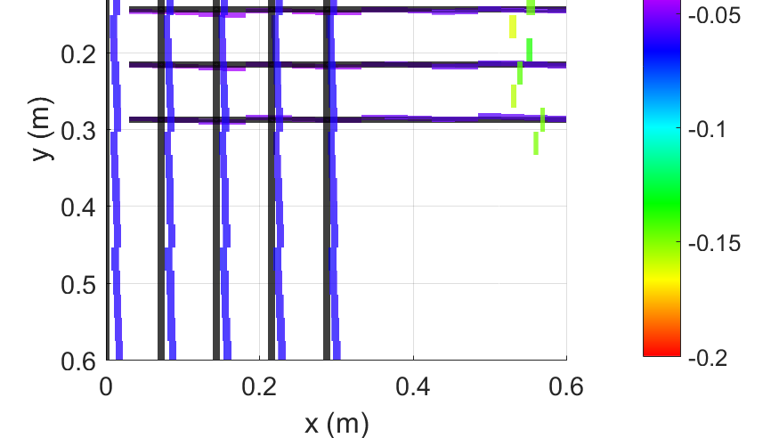 - Für Quickscan-Recording und Imagescan-Processing wurde eine Prozesskette zur Durchmesser-, Cover und Lagenschätzung von Armierungseisen entwickelt, welche die Signale lokal auswertet (lokaler Ansatz). Die Auswertestrategie basiert hier auf den Informationen einzelner Spulen oder Spulenkombinationen, welche unabhängig voneinander und Spur für Spur ausgewertet werden.