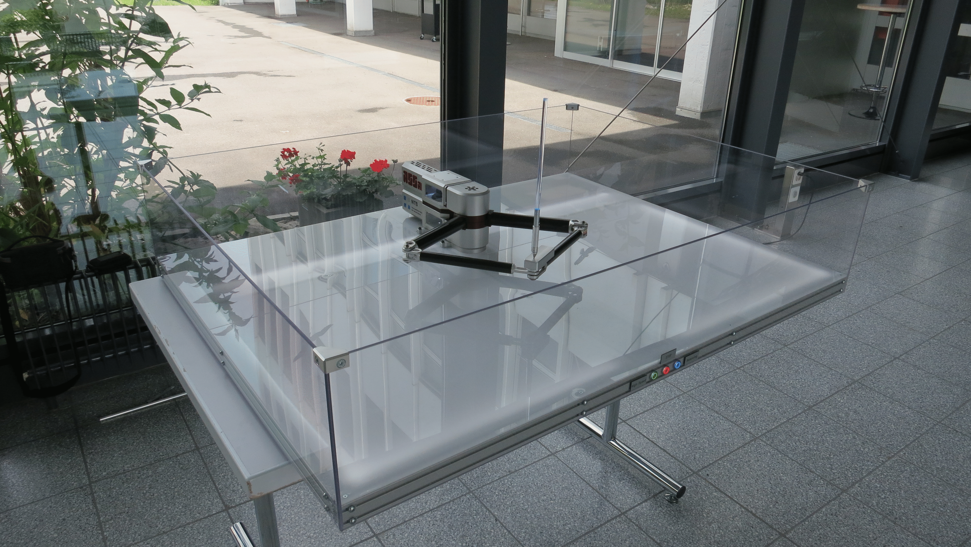 Dieser SCARA-Roboter wurde im Auftrag der Firma ASS AG erstellt, welche ein Demonstrationsobjekt für Messen mit den firmeneigenen Kronenrädern wünschten. Um sowohl die Genauigkeit dieser Getriebeart wie auch die Belastbarkeit aufzuzeigen, kann der Roboter ein invertiertes Pendel balancieren sowie auch mit 120 m/s2 beschleunigen.