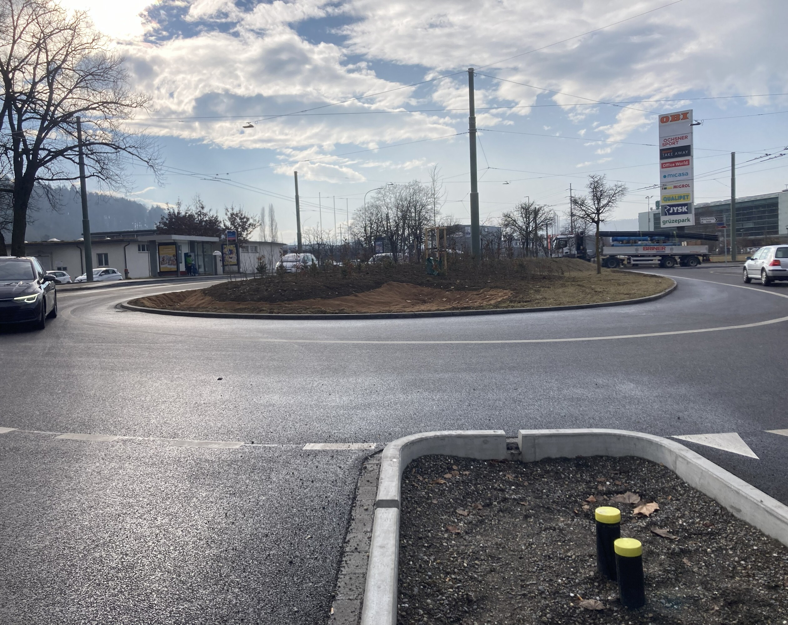 Im Kreisel werden sechs unterschiedliche Reinigungssysteme umgesetzt – von bepflanzten Versickerungsmulden und Baumrigolen mit speziell entwickeltem Substrat bis hin zu neuartigen technischen Filtersystemen wie Adsorberrinnen. Diese Schwammstadtelemente filtern Schadstoffe wie Schwermetalle und Reifenabrieb aus dem Strassenabwasser und verbessern gleichzeitig das Mikroklima durch Begrünung und Verdunstung