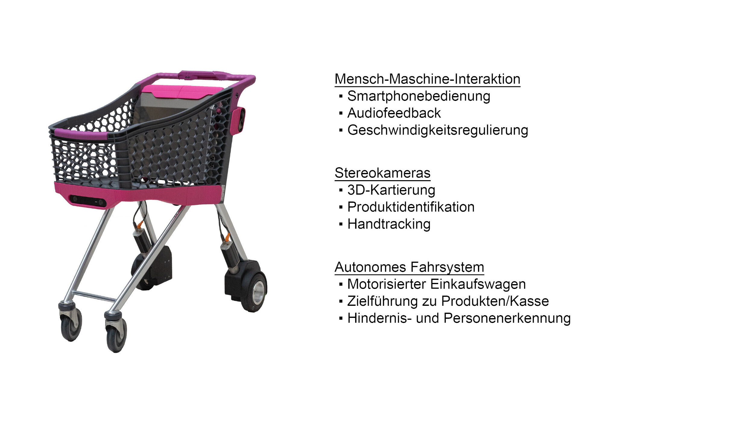 Die Stereokameras am Wagen dienen dabei nicht nur der dreidimensionalen Kartierung des Supermarkts, sie identifiziert auch die Produkte sowie die Hand des Benutzers, der Benutzerin und leitet durch akustische Anweisungen zum gewünschten Produkt. Für die Erkennung des gesuchten Produkts wird künstliche Intelligenz eingesetzt. Durch diesen innovativen Ansatz ist es nicht notwendig, den Barcode des Produkts zu scannen. Die Produkte werden unabhängig von ihrer Ausrichtung im Regal zuverlässig detektiert. Sollte ein Regal leer sein, wird die Kundin, der Kunde informiert.