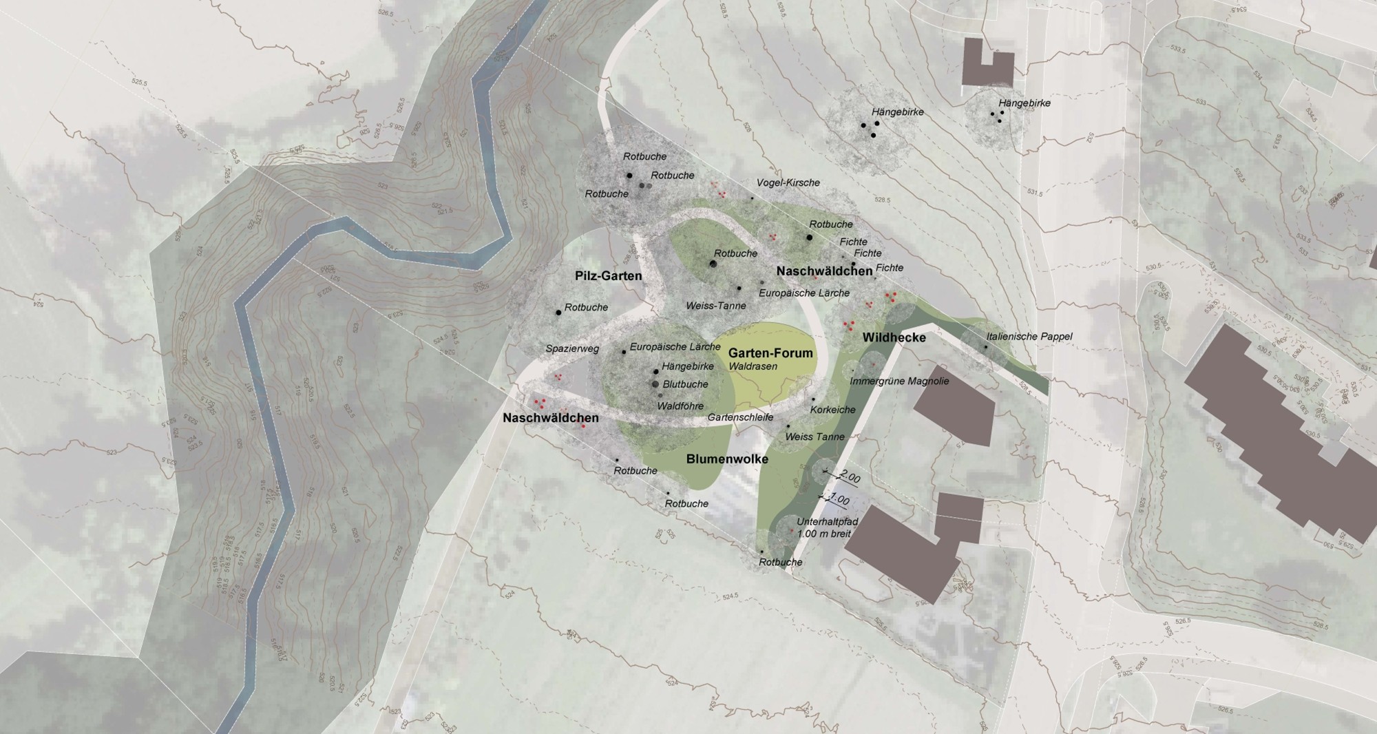 Das Projekt befasst sich mit der Umgestaltung eines Waldstücks in der Gemeinde Küsnacht, das über längere Zeit rechtswidrig als Schaugarten genutzt wurde. Ziel war es, einen öffentlich zugänglichen, naturnahen Ersatzraum zu schaffen, der ökologische Aufwertung, Erholung und Umweltbildung verbindet. Der Entwurf entwickelt einen kleinräumigen Park mit unterschiedlichen waldtypischen Atmosphären, darunter Waldgarten, Waldlichtung, Naschwäldchen und thematische Bereiche wie ein Pilzgarten. Strukturierende Wege, gezielte Blickbeziehungen und kleinräumige Topografiemodellierungen schaffen abwechslungsreiche Raumerlebnisse. Die Gestaltung basiert auf standortgerechten, überwiegend einheimischen Gehölzen und Stauden und fördert gezielt Biodiversität, Klimaresilienz und ökologische Vernetzung. Ergänzend werden partizipative Nutzungen, Informationselemente sowie eine etappierte Umsetzung vorgeschlagen, um den Freiraum langfristig gemeinsam mit der Bevölkerung zu entwickeln.
