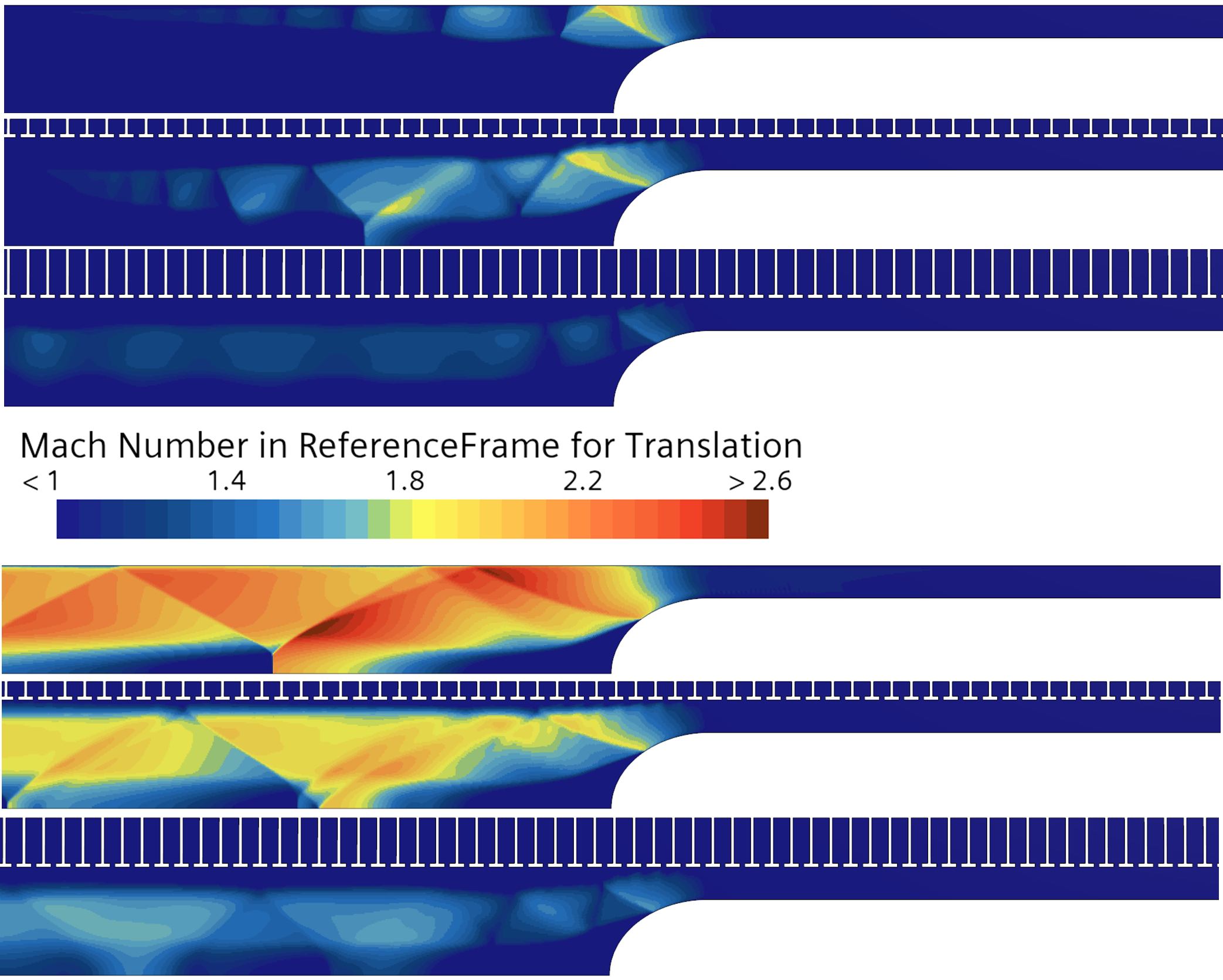 In der untenstehenden Abbildung zeigt die Mach-Zahl-Verteilung am Heck eines Fahrzeugs, das sich mit 200 m/s in einer Tunnelröhre bewegt – vor und nach der Wechselwirkung mit der Reflexionswelle. Die Rohrwände werden dabei mit pseudo-perforierten Strukturen modelliert. Die Simulationen zeigen, dass durch die Anwesenheit dieser pseudo-perforierten Wände die Anordnung der Schrägstosswellen sowie des Überschallbereichs im Heck des Fahrzeugs verändert wird. Zudem verringert sich die Ausbreitungsgeschwindigkeit der Stosswelle vor dem Fahrzeug, was zu einer verzögerten Wechselwirkung zwischen der Reflexionswelle und dem Fahrzeug führt und somit zu einer weiteren Reduktion des Luftwiderstands beiträgt.