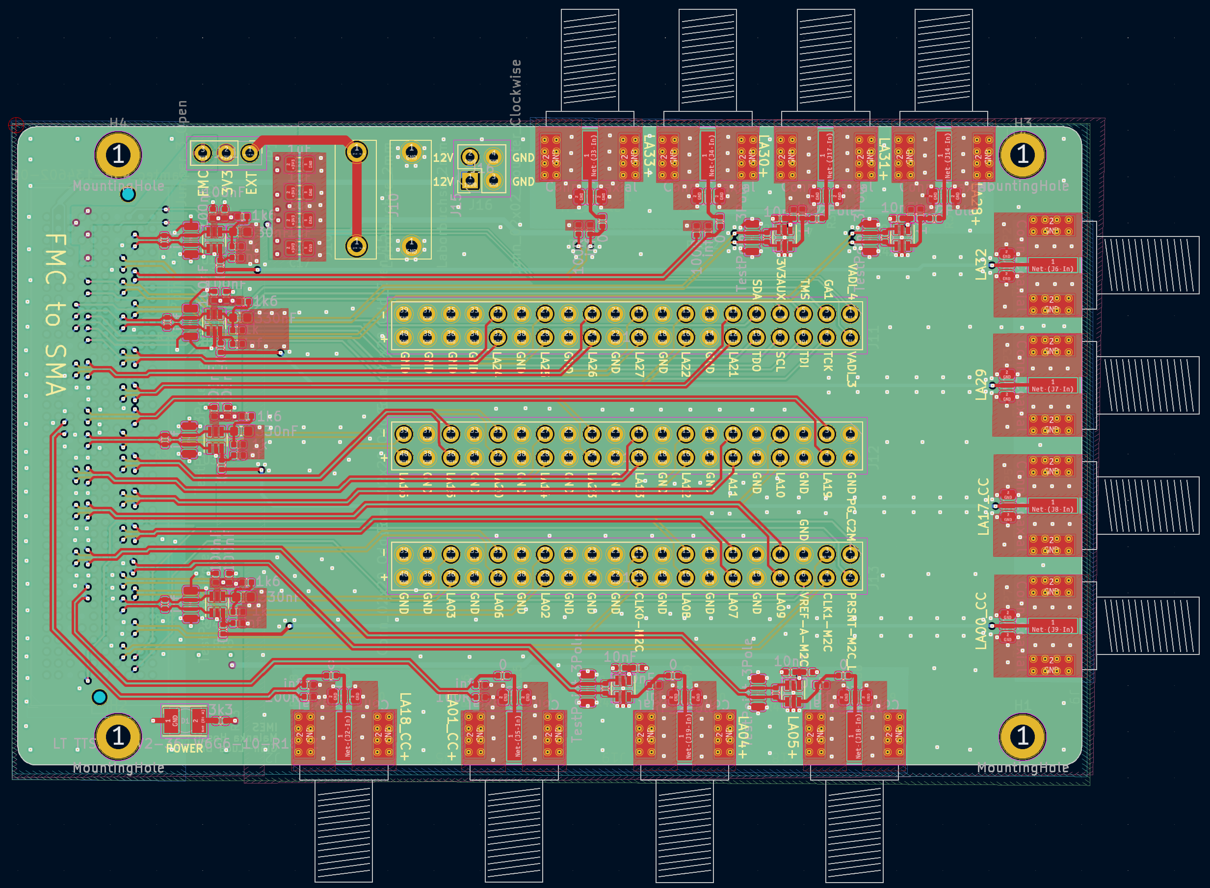 Die Entwicklung von Highspeed FPGA Designs benötigt zu Testzwecken, zur Fehlersuche sowie zur Datenanalyse externe Hardware, zum Beispiel Signalgeneratoren und Oszilloskope. Um die Signalqualität möglichst hoch zu halten, werden zur Signalführung Koaxialkabel verwendet. Um nun die Signale vom FPGA direkt zu den Instrumenten zu führen, wurde ein PCB entwickelt, welches die Signale vom FPGA über einen FMC Stecker zu SMA Buchsen führt.