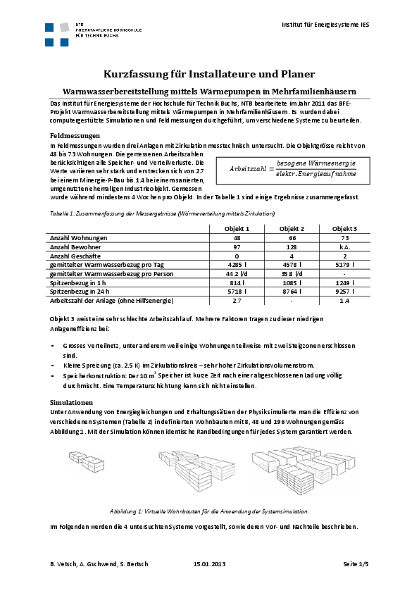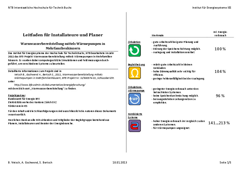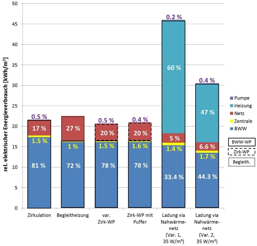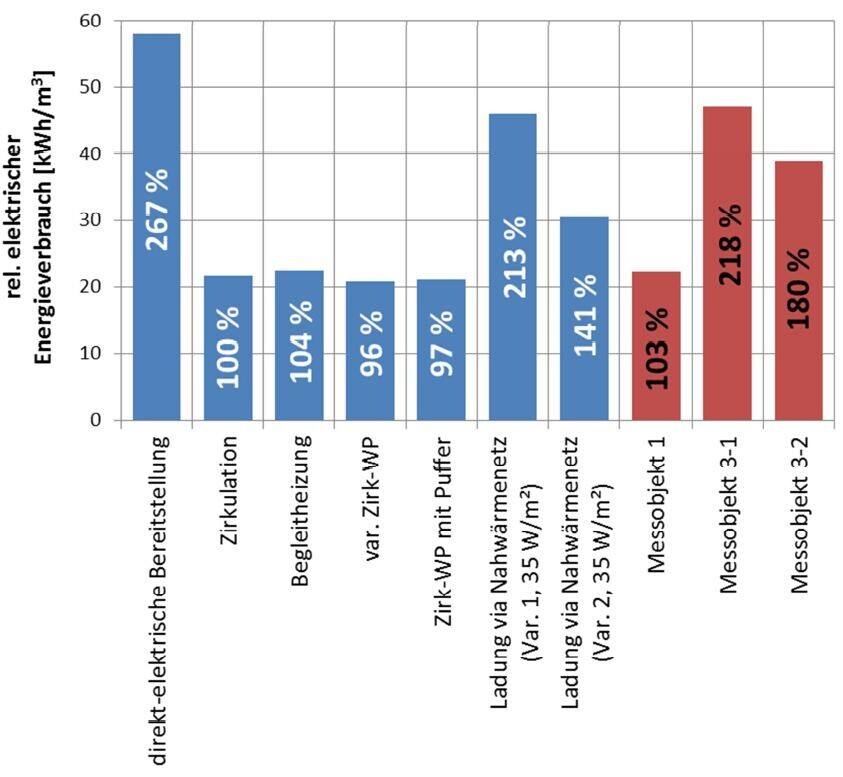 Allgemein zeigte sich, dass sich Wärmepumpen auch bei der BWW-Erzeugung in grossen Überbauungen eignen. Systeme mit einer dezidierten Zirkulations-wärmepumpe verfügen über die beste Energieeffizienz. Herkömmliche Zirkulationssysteme benötigen circa 5% mehr Strom und Systeme mit elektrischer Begleitheizung zeigen bei einer grösseren Robustheit einen Mehrverbrauch von circa 10%. Anlagen, welche dezentrale Speicher via Nahwärmenetz mit der Heizungswärmepumpe laden, verbrauchen im Normalfall über das Doppelte an elektrischer Energie im Vergleich zu dezidierten BWW-Systemen.
