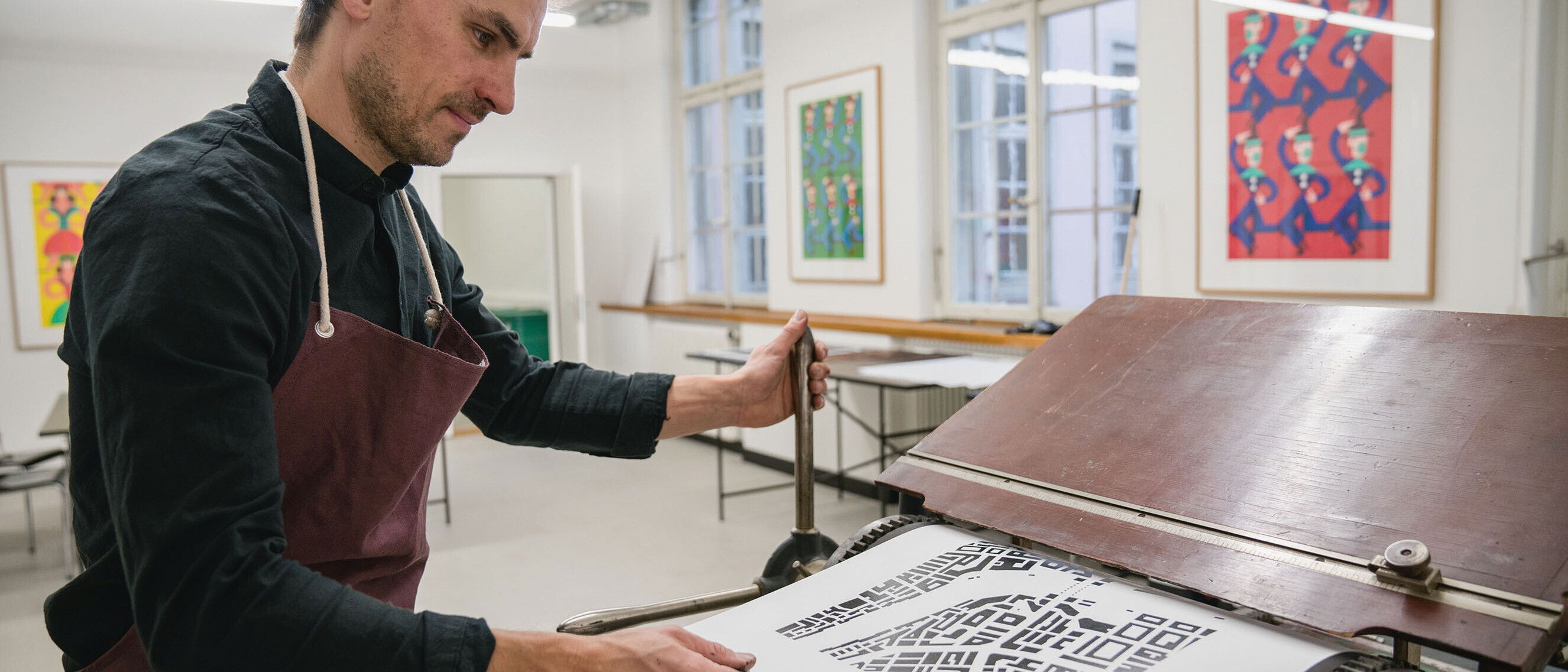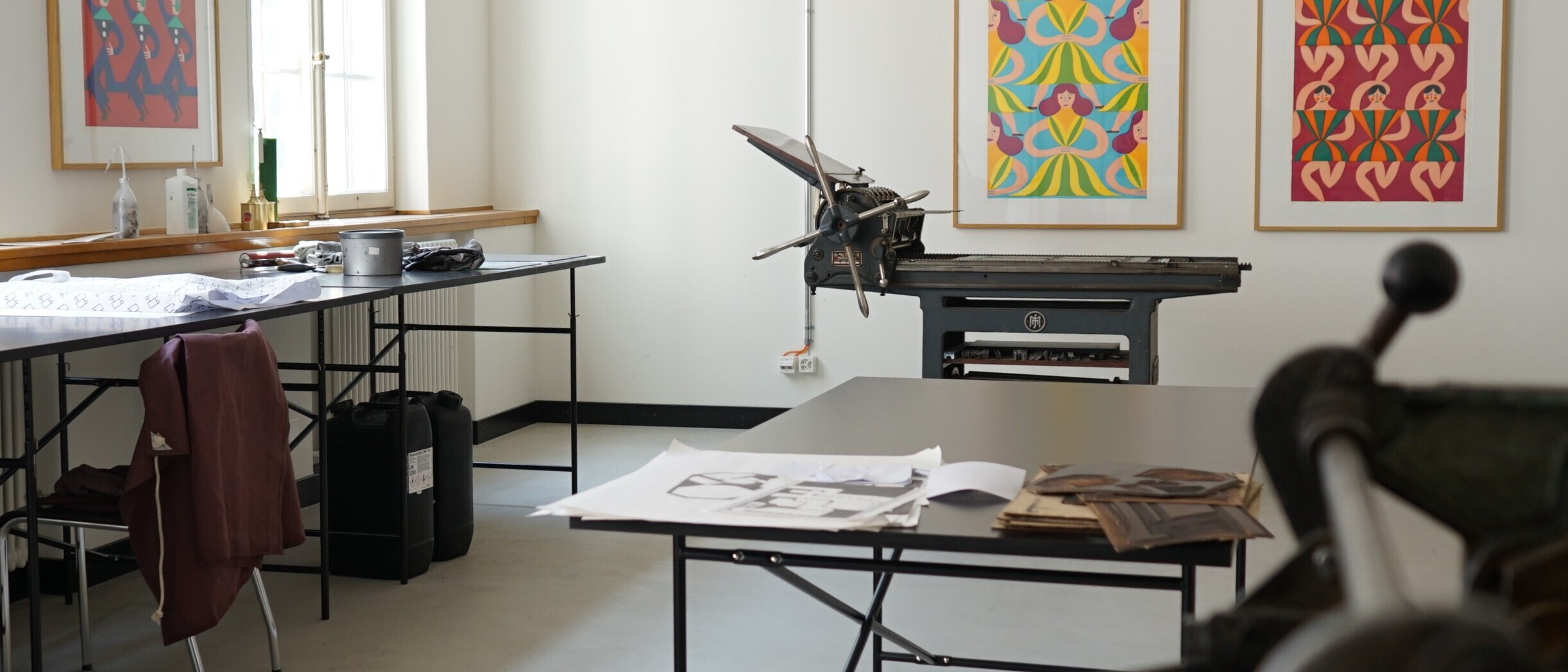 Zwei Druckerpressen für Hochdruckverfahren bilden das Herz der Druckwerkstatt. Hier werden vor allem Linolschnitte in Schwarzweiss oder Farbe hergestellt. Das Bearbeiten der Druckplatten führt die Studierenden anschaulich in die Thematik von Figur und Grund, Masse und Raum ein.