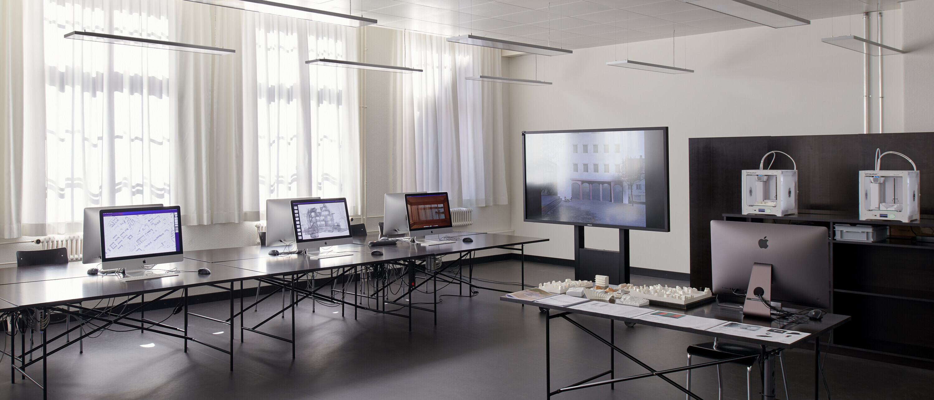 Arbeitsstationen mit allen gängigen CAD-, 3D-, Rendering-, Bildbearbeitungs- und Publishinganwendungen stehen in der Digitalwerkstatt zur Verfügung. Daneben gehören Drohnen, LIDAR-Scanner und VR-Brillen, aber auch Plotter, 3D-Drucker und Lasercutter zur Ausrüstung. In der Digitalwerkstatt werden analoge und digitale Aufnahme- und Darstellungstechniken miteinander kombiniert.