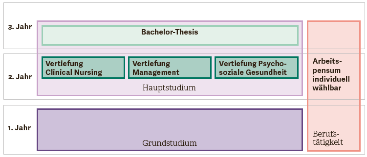 Das Bachelor-Studium für Personen mit Höherer Berufsbildung in Pflege (HF) dauert insgesamt fünf Semester. Die Semester dauern generell 16 Wochen, wobei die ersten 14 Wochen der Theorievermittlung dienen. In den letzten zwei Wochen finden jeweils Prüfungen statt. Pro Woche sind zusätzlich bis zu 12 Stunden für das Selbststudium einzurechnen.