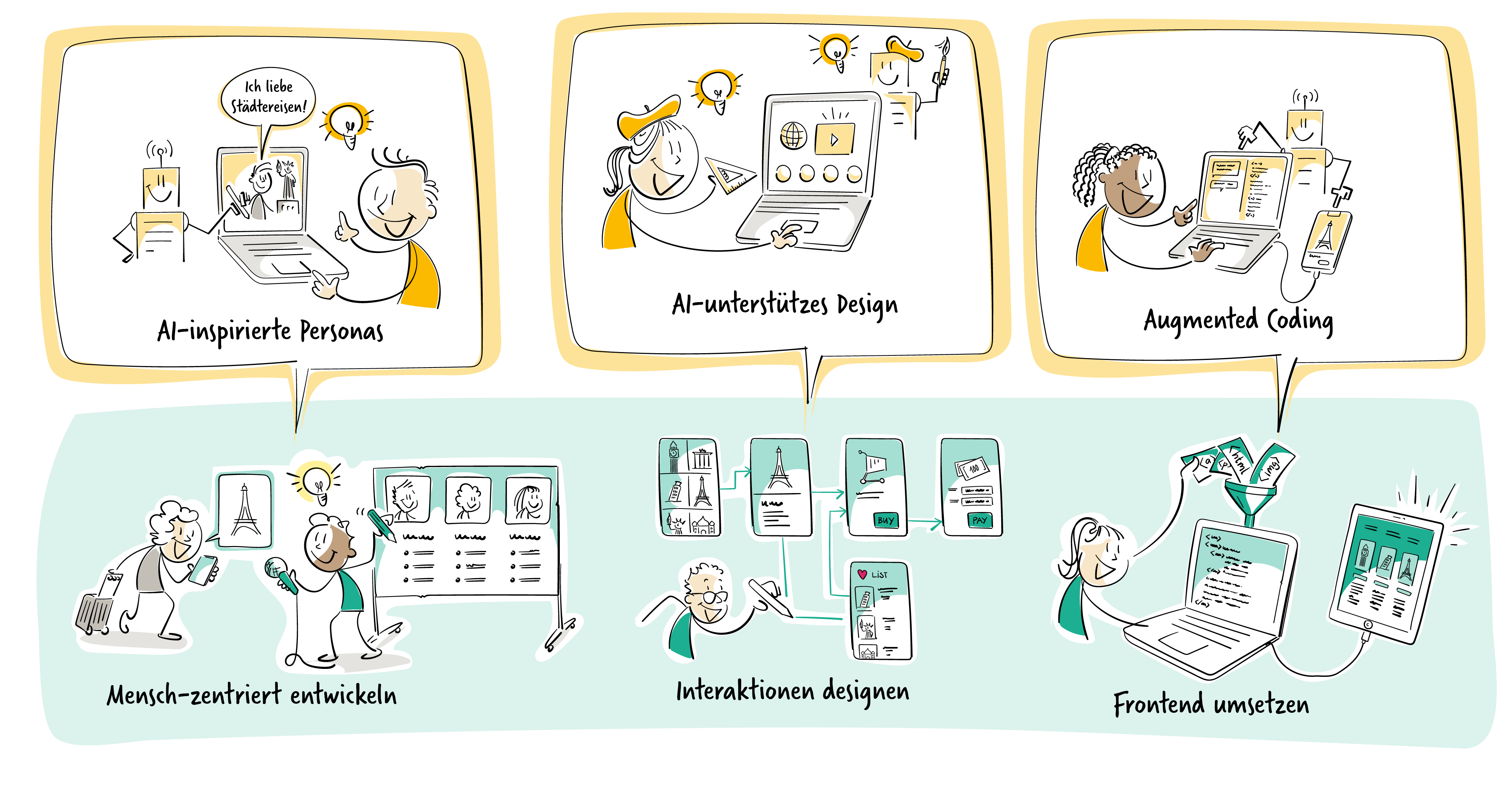 - Menschenzentrierte Lösungen: Auch bei AI-basierten Anwendungen steht die Nutzerperspektive im Zentrum. Sie gestalten Interfaces, die intuitiv, verständlich und attraktiv sind.
