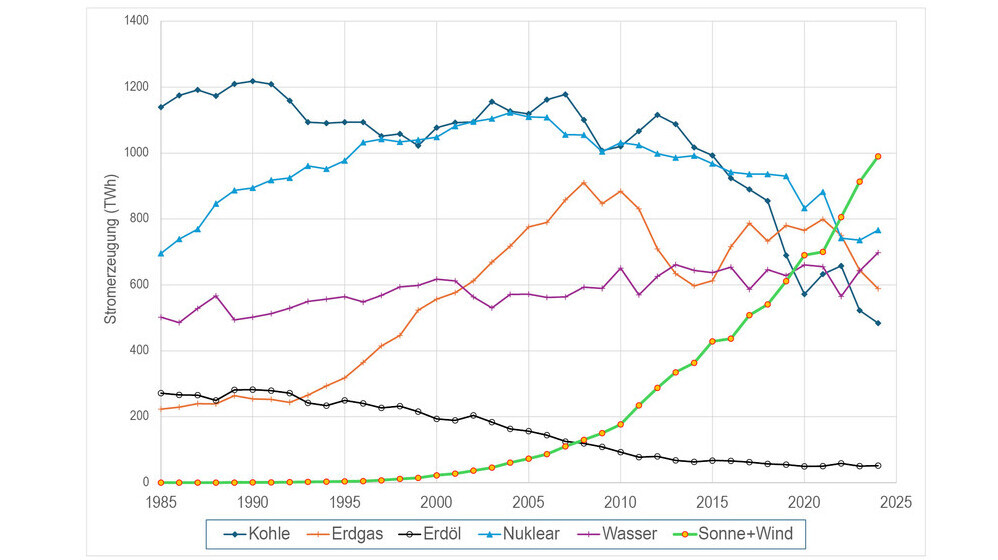Die Grafik zeigt die Erzeugung elektrischer Energie in Europa seit dem Jahr 1985. Die Bedeutung von Kohle und Öl hat stetig abgenommen, Kernenergie und Erdgas hatten ihre Glanzzeit vor 20 Jahren und die Wasserkraft liefert einen fast konstanten Beitrag. Die technologische Revolution ist bei den erneuerbaren Energien (Sonne und Wind) passiert. Sie liefern inzwischen etwa 25 % des europäischen Stromes, mit Wachstumsraten vom über 10 % pro Jahr. Wieso teure und schmutzige Energie aus dem Ausland importieren, wenn saubere Energie gratis zur Verfügung steht? (Quelle: Energy Institute, Statistical Review of World Energy).
