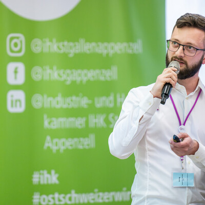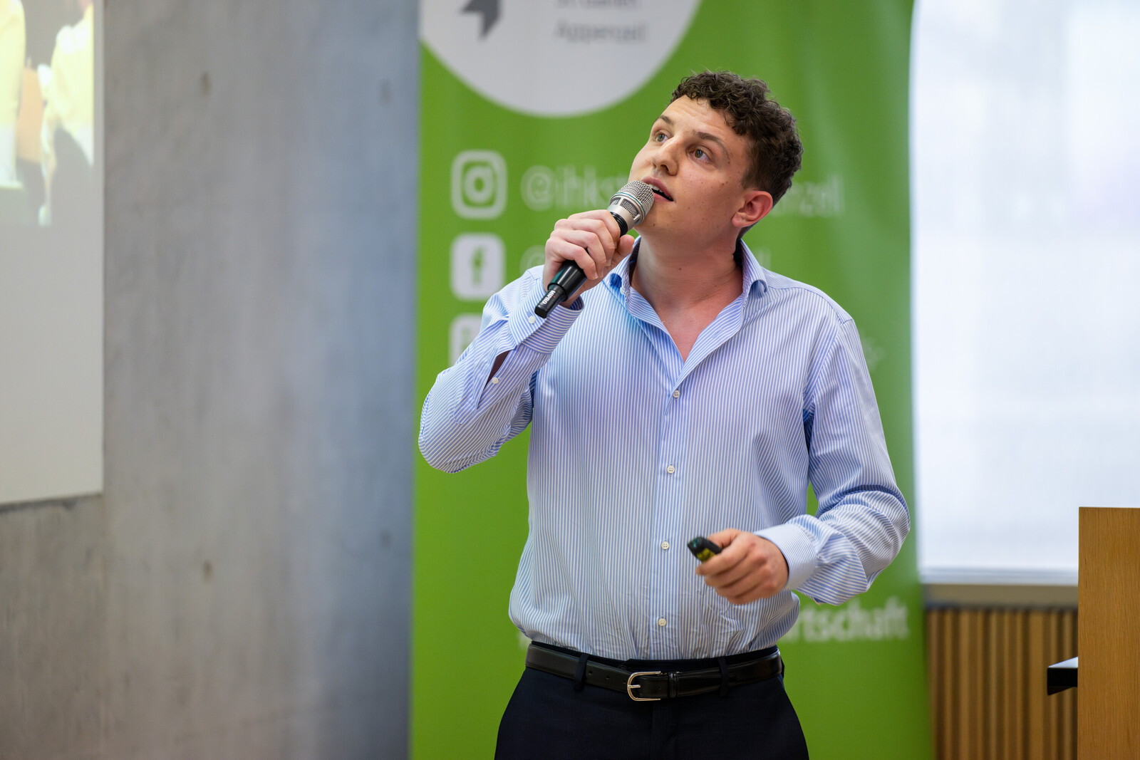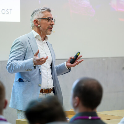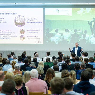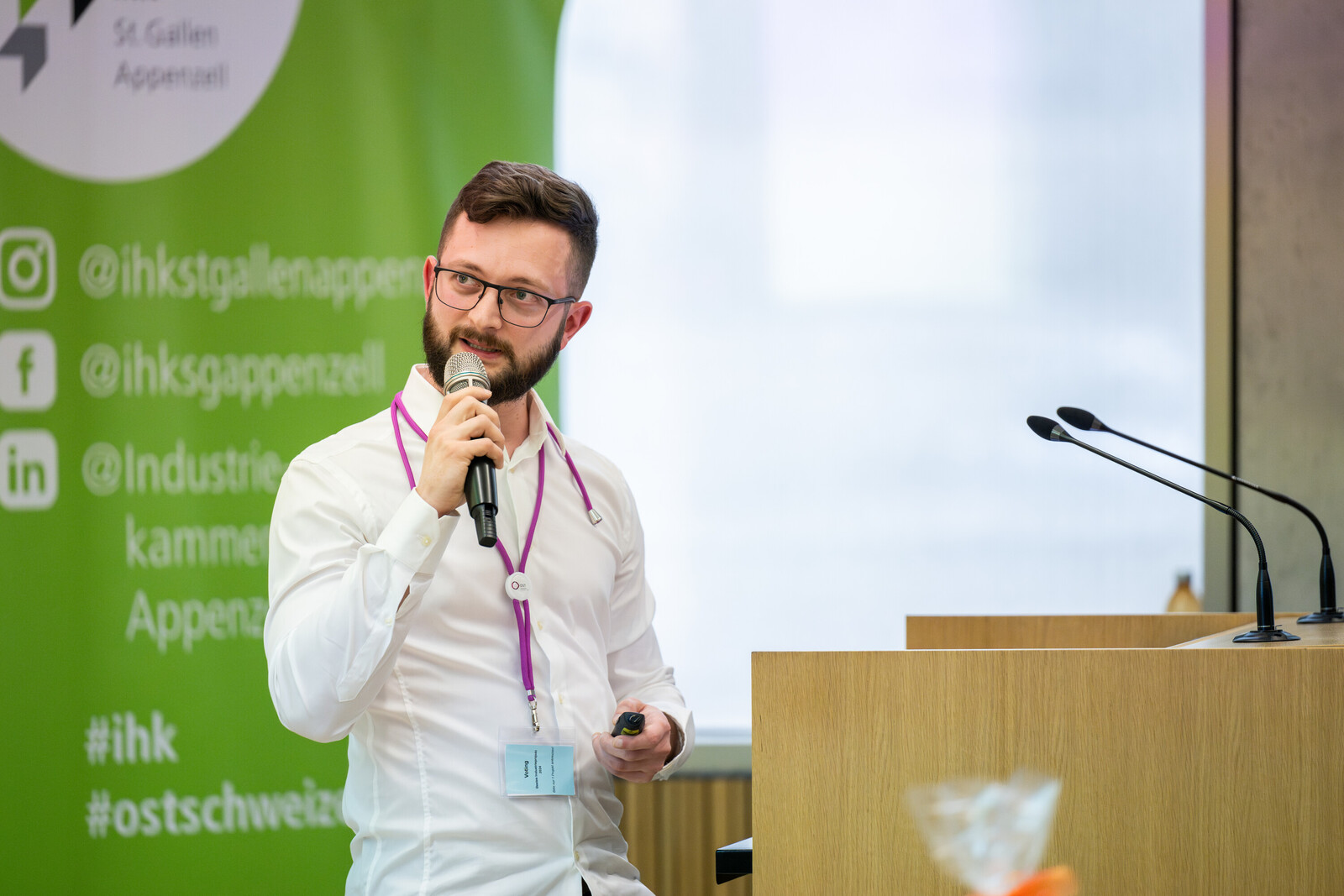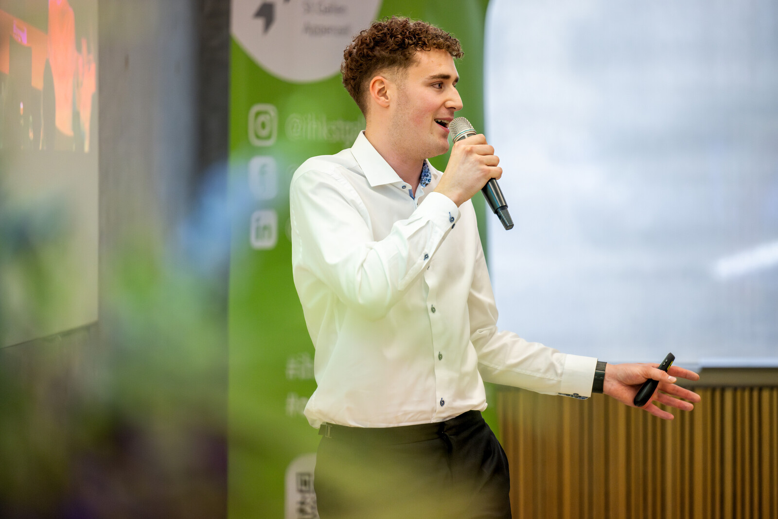 Moderiert wurde der Abend von Thomas Utz, Programmleiter des Moduls «Industrieprojekt». Für ein Grusswort standen Knut Siercks, Leiter des Departements Technik, Markus Bänziger, Direktor der Industrie- und Handelskammer St.Gallen-Appenzell und Michael Federer, Leiter alumniOST auf der Bühne.